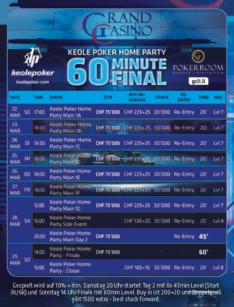 Heute gibt es neuerlich ein Freezeout Turnier, beim CHF 130 + 20 Saturday Freezeout warten CHF 10.000 GTD, gespielt wird mit 40.000 Chips und 30 Minuten Levels. Bei den Cash Games wird ab CHF 1/3 NLH bzw. CHF 2/2 PLO mit einem Rake CAP von CHF 5 und Bad Beat Jackpot gespielt. Alles zum Pokerangebot des Grand Casino Liechtenstein gibt es auf der Webseite gcli.li, auf der Poker Facebook Seite des GCLI bliebt Ihr immer auf dem Laufenden.