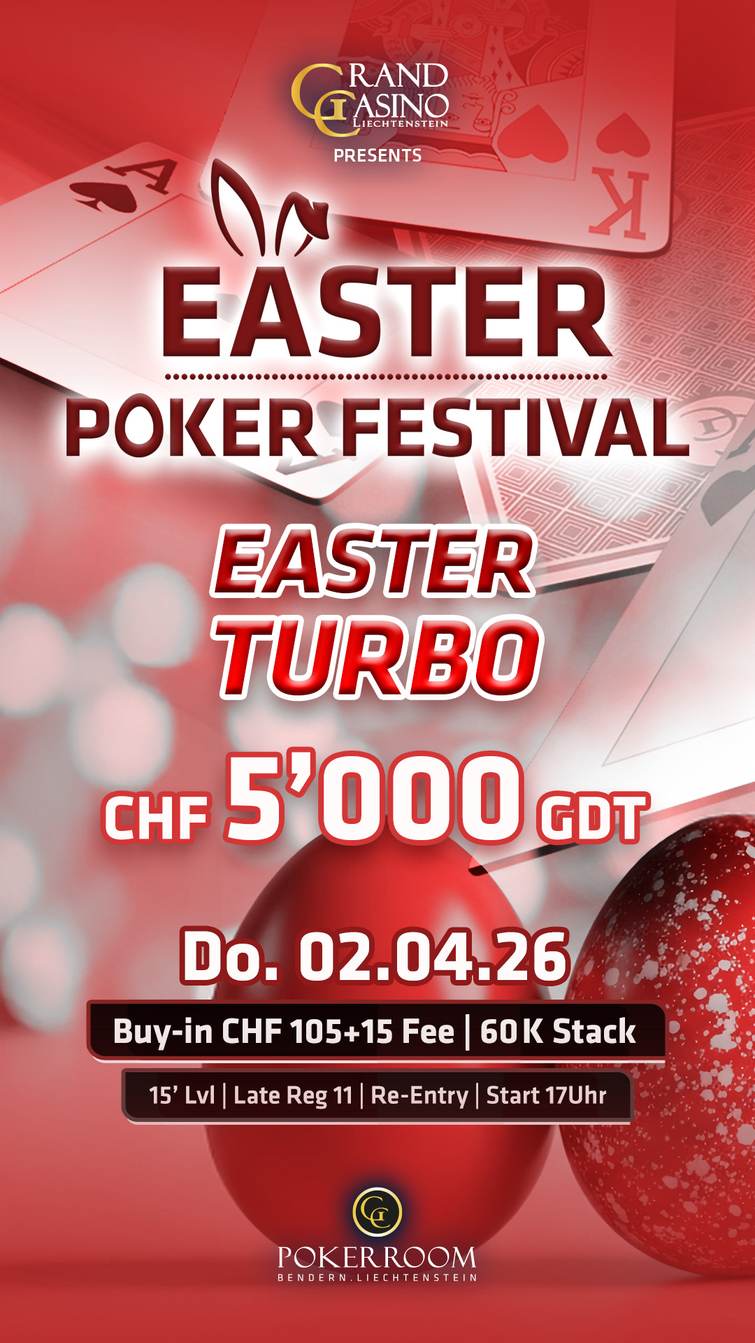 Heute steht das CHF 110 + 20 Easters Special 10k an. Mit 40.000 Chips und 25 Minuten Levels wird um mindestens CHF 10.000 gespielt. Bei den Cash Games wird ab CHF 1/3 NLH bzw. CHF 2/2 PLO mit einem Rake CAP von CHF 5 und Bad Beat Jackpot gespielt. Alles zum Pokerangebot des Grand Casino Liechtenstein gibt es auf der Webseite gcli.li, auf der Poker Facebook Seite des GCLI bliebt Ihr immer auf dem Laufenden.