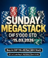 60.000 Chips und 20 Minuten Levels waren die Startbedingungen beim Sunday Megastack, CHF 5.000 hatte man als Preisgeld garantiert. Mit 48 Startern und weiteren 13 Re-Entries kamen CHF 6.710 in den Pot, die top sieben Plätze waren bezahlt. CHF 350 gab es als Min-Cash, CHF 2.110 warteten auf den Sieger. In diesem Fall gab es eine Siegerin, Sandra Bellafiore setzte sich im Heads-up gegen Jonas Rudigier durch und kassierte die Siegpprämie.