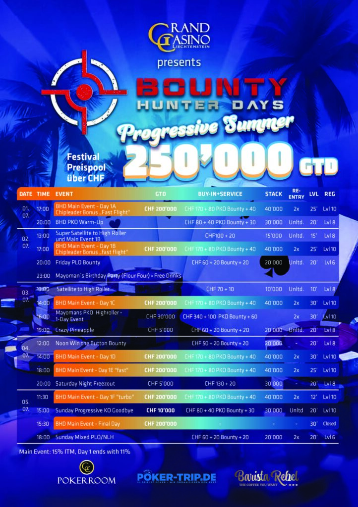 Heute gibt es beim CHF 220 + 30 Main Event (CHF 150.000 GTD/50k/30′) die letzten beiden Flights, als Side Event sorgt noch das CHF 55 + 50 + 15 Hansi Hunt (CHF 5.000 /40k/20′) für Abwechslung. Die Cash Games starten diese Woche täglich bereits ab 15 Uhr, wie immer wird ab CHF 1/3 NLH bzw. CHF 2/2 PLO mit einem Rake CAP von CHF 5 und Bad Beat Jackpot gespielt. Alles zum Pokerangebot des Grand Casino Liechtenstein gibt es auf der Webseite gcli.li, auf der Poker Facebook Seite des GCLI bliebt Ihr immer auf dem Laufenden.