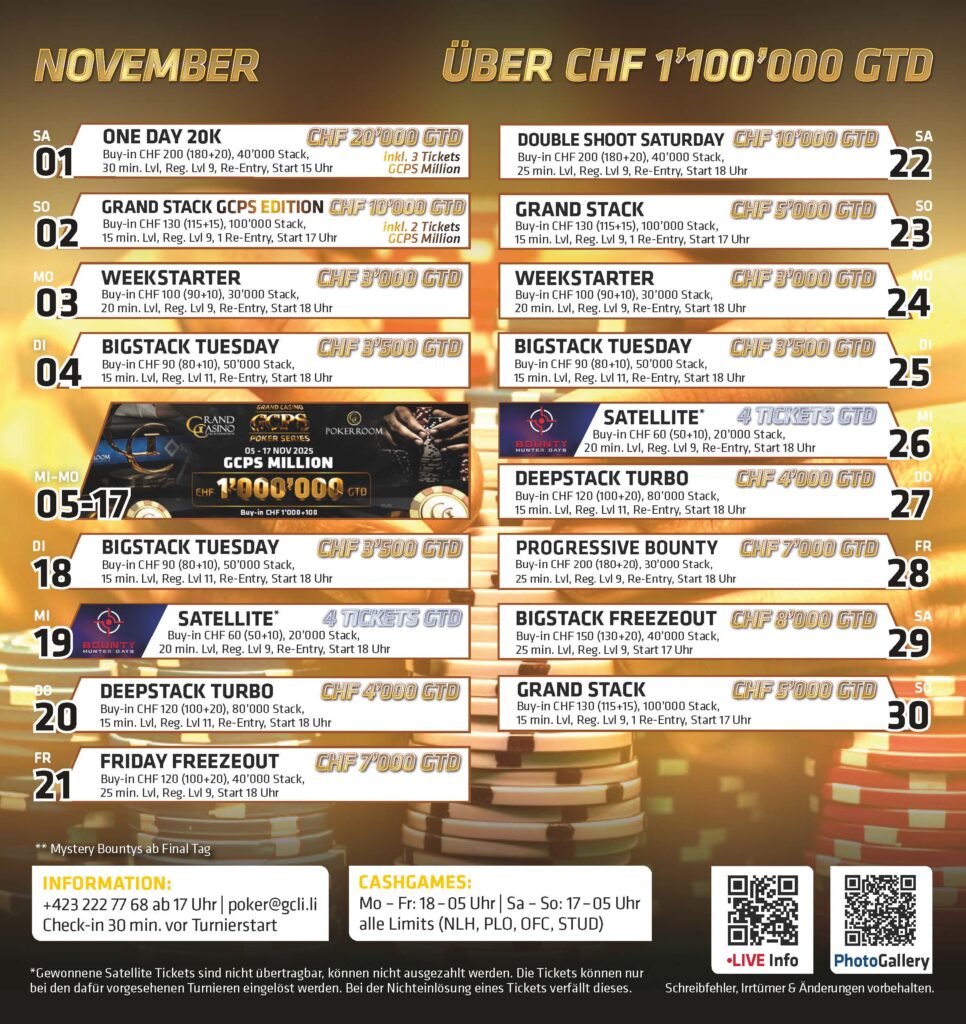 Das nächste Satellite gibt es übrigens am 10. Dezember, heute wird mit dem gewohnten CHF100 + 20 Deepstack Turbo (CHF 4.000 GTD/80k/15′) fortgesetzt. Bei den Cash Games wird wie immer ab CHF 1/3 NLH bzw. CHF 2/2 PLO mit einem Rake CAP von CHF 5 und Bad Beat Jackpot gespielt. Alles zum Pokerangebot des Grand Casino Liechtenstein gibt es auf der Webseite gcli.li, auf der Poker Facebook Seite des GCLI bliebt Ihr immer auf dem Laufenden.