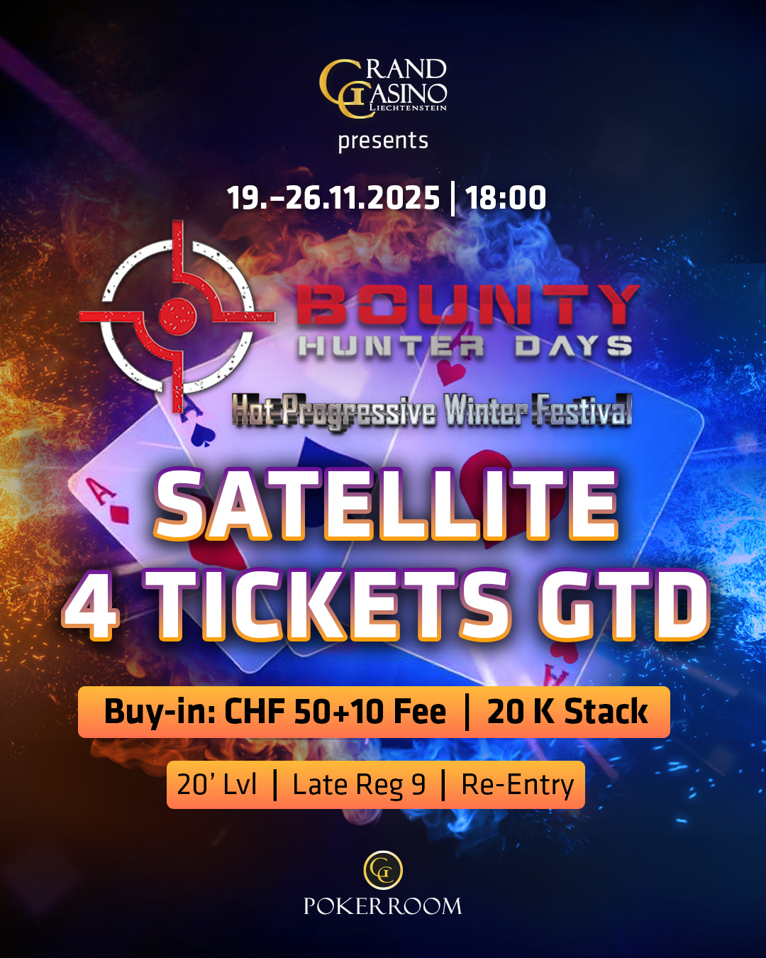Das zweite Satellite für das „Hot Progressive Winter Festival“ der Bounty Hunter Days powered by poker-trip.de im Grand Casino Liechtenstein (GCLI) brachte gestern, den 26. November, weitere vier CHF 290 Tickets.