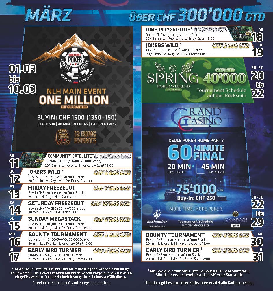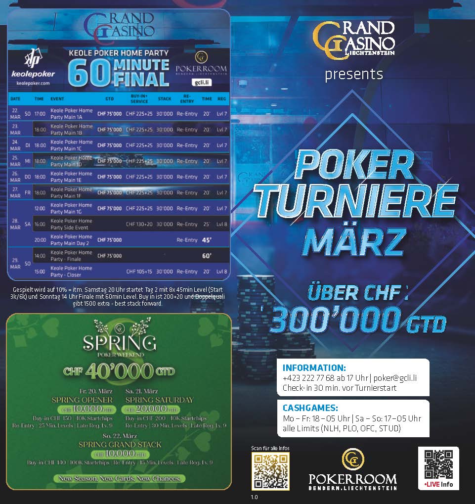 Bei den Cash Games wird täglich ab CHF 1/3 NLH bzw. CHF 2/2 PLO gespielt. Alles zum Pokerangebot des Grand Casino Liechtenstein gibt es auf der Webseite gcli.li, auf der Poker Facebook Seite des GCLI bliebt Ihr immer auf dem Laufenden.