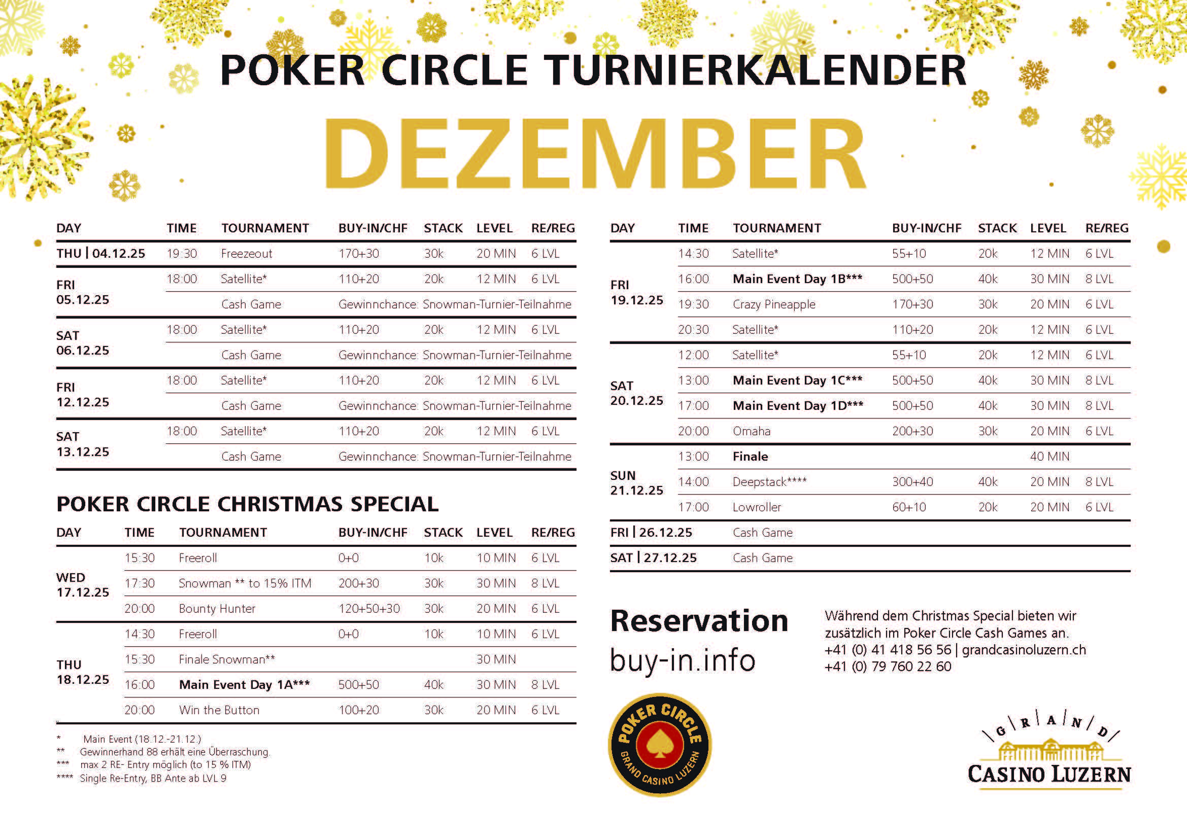 Als Side Event gibt es heute auch das  CHF 300 + 40 Deepstack, hier wird mit 40.000 Chips und 20 Minuten Levels gespielt, erst ab Level 9 wird mit BB Ante gespielt. Wie immer gibt es die Möglichkeit zur Anmeldung über  buy-in.info, weitere Infos rund um das Grand Casino Luzern findet Ihr unter grandcasinoluzern.ch.