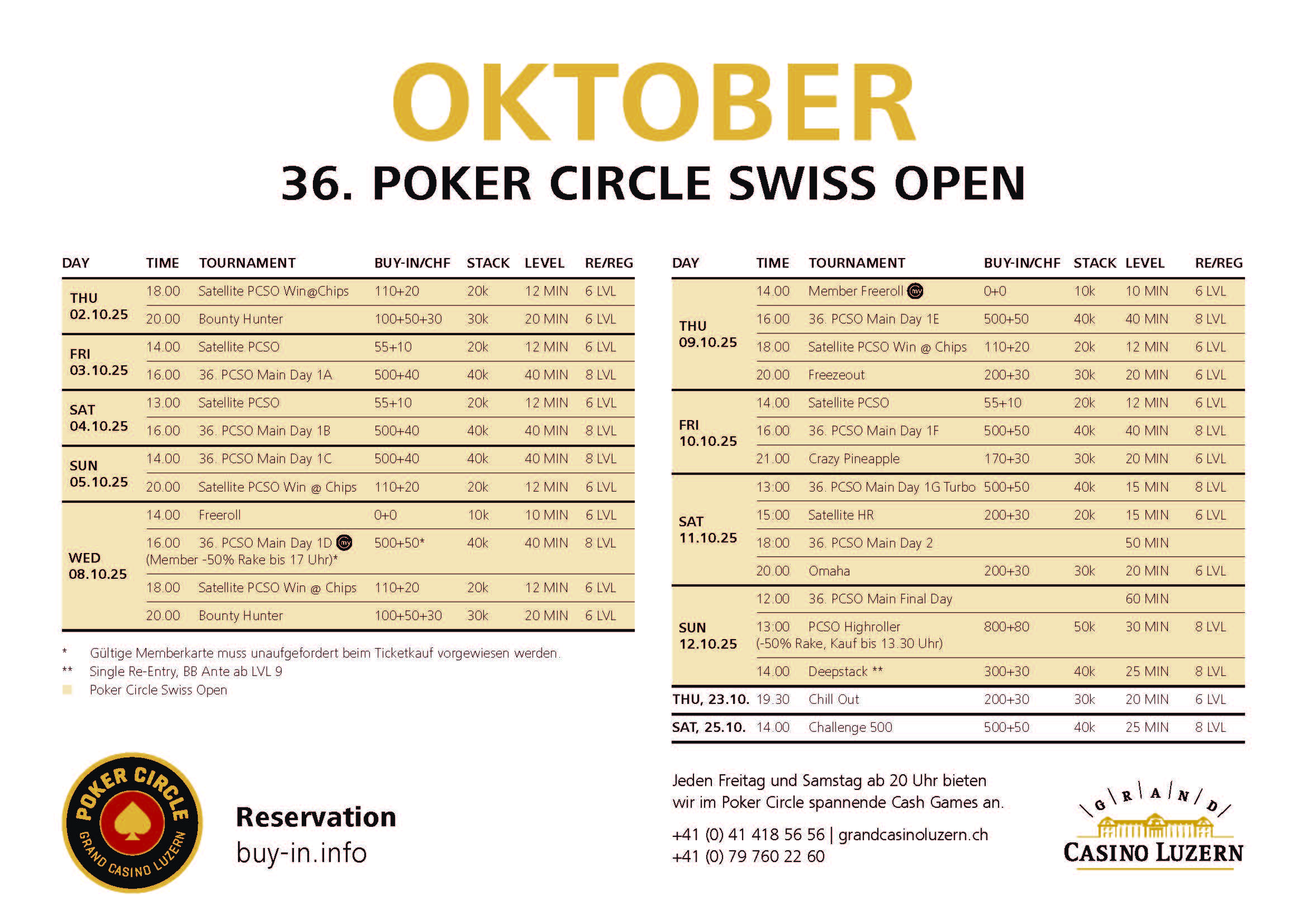 Wie immer könnt Ihr Euch für alle Turniere über buy-in.info anmelden, weitere Infos rund um das Grand Casino Luzern findet Ihr unter grandcasinoluzern.ch.