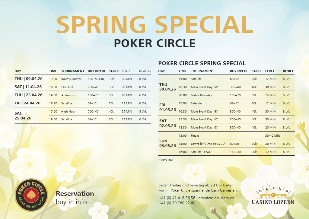 Die nächste Ausgabe der Poker Circle Swiss Open (PCSO) im Grand Casino Luzern kommt erst von 21. bis 25. Mai, dieses Wochenende sorgt dafür das CHF 300 + 40 Poker Circle Spring Special für kurzweilige Abwechslung.