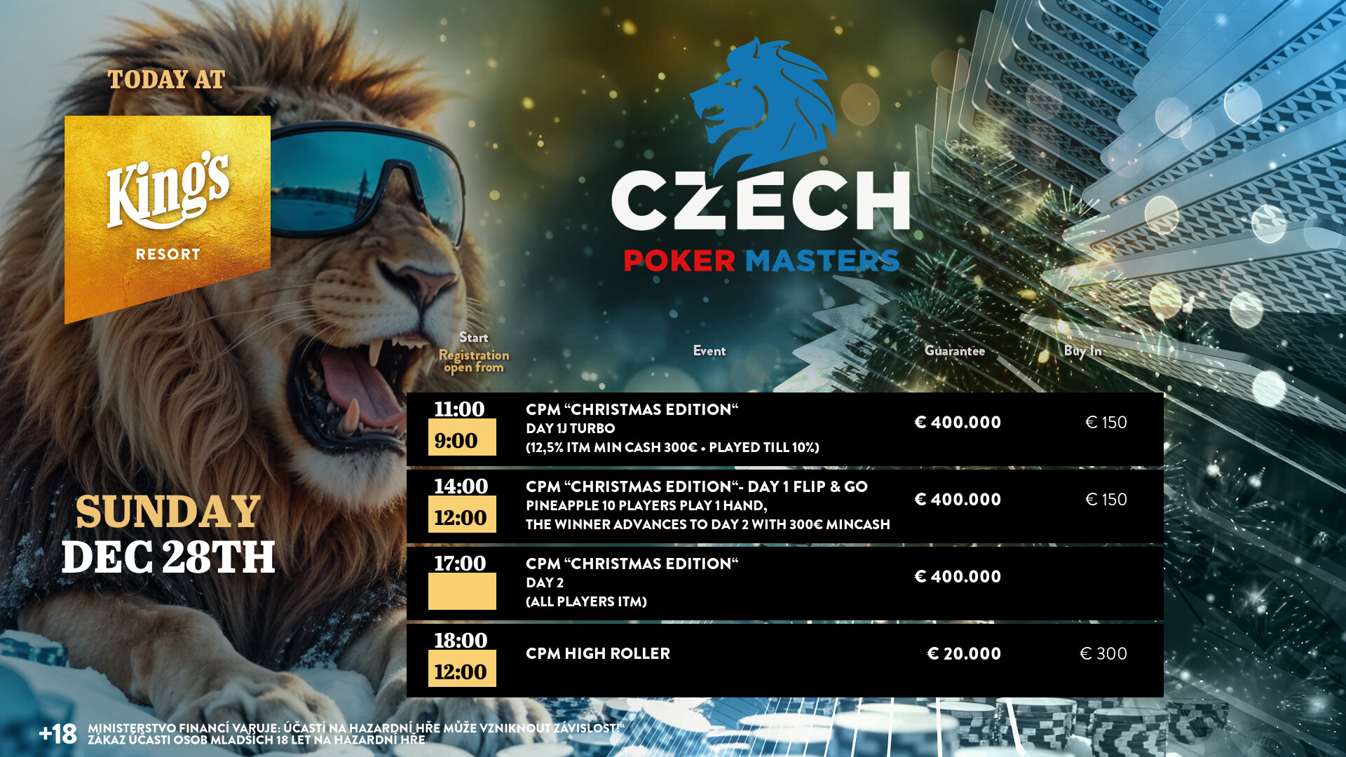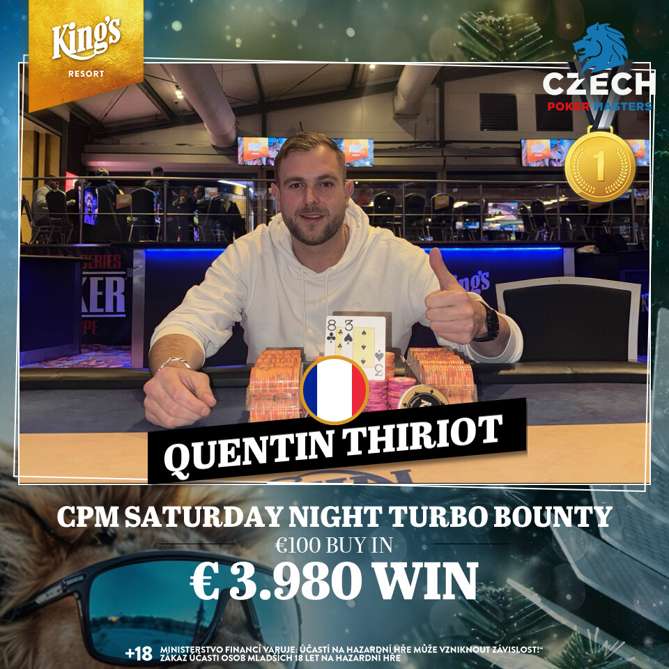 Heute gibt es noch den Turbo Flight und die Flips bei der € 150 Czech Poker Masters Edition (€ 400.000 GTD inkl. 10 x € 3k King’s Million EPC Packages), als Side Event wartet das € 300 CPM High Roller (€ 20.000 GTD/100k/25′). Die Cash Games starten wie gewohnt ab den Blinds € 1/2 NLH bzw. € 2/2 PLO. Alle Infos zum kompletten Angebot findet Ihr unter kings-resort.com.