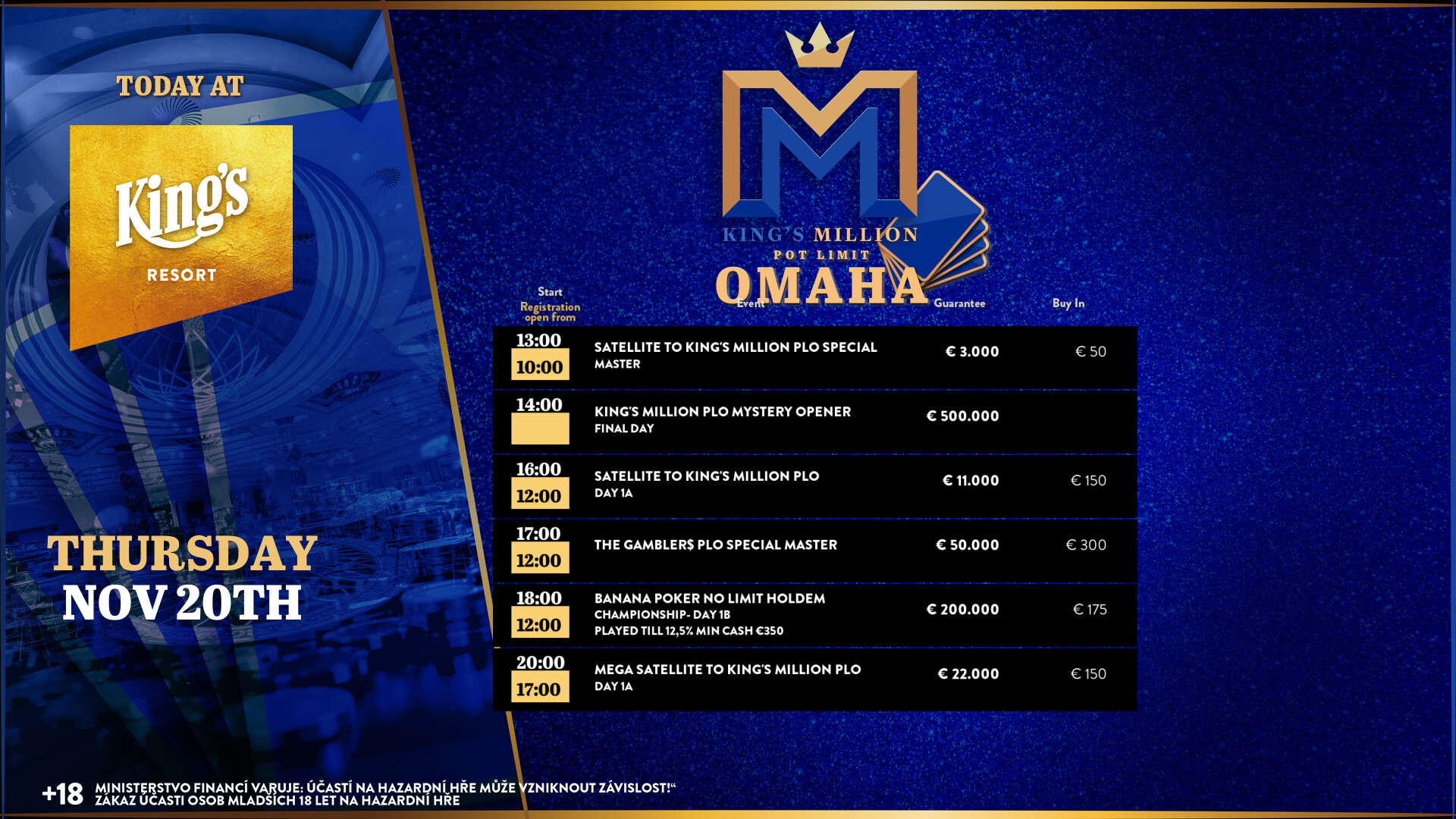 Schon heute geht es im King’s Resort Rozvadov in die erste Entscheidung beim King’s Million Omaha Festiva. August „Justy“ Schlegl führt das Finale beim € 2.000 + 500 PLO Mystery Opener (€ 500.000 GTD) an.