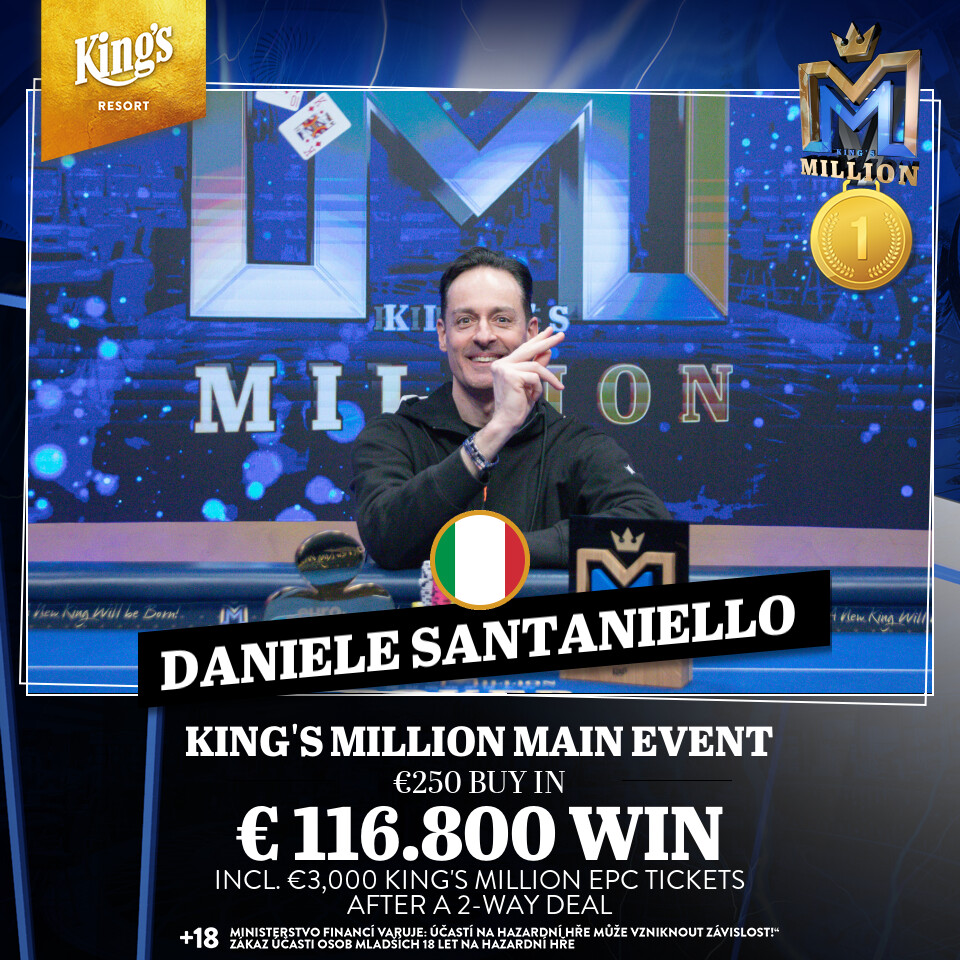 Als Shortstack war der Italiener Daniele Santaniello an den Final Table beim € 250 King’s Million im King’s Resort Rozvadov gekommen, als Sieger ging er nach einem Deal mit € 113.300 + € 3k King’s Million EPC Package nach Hause.