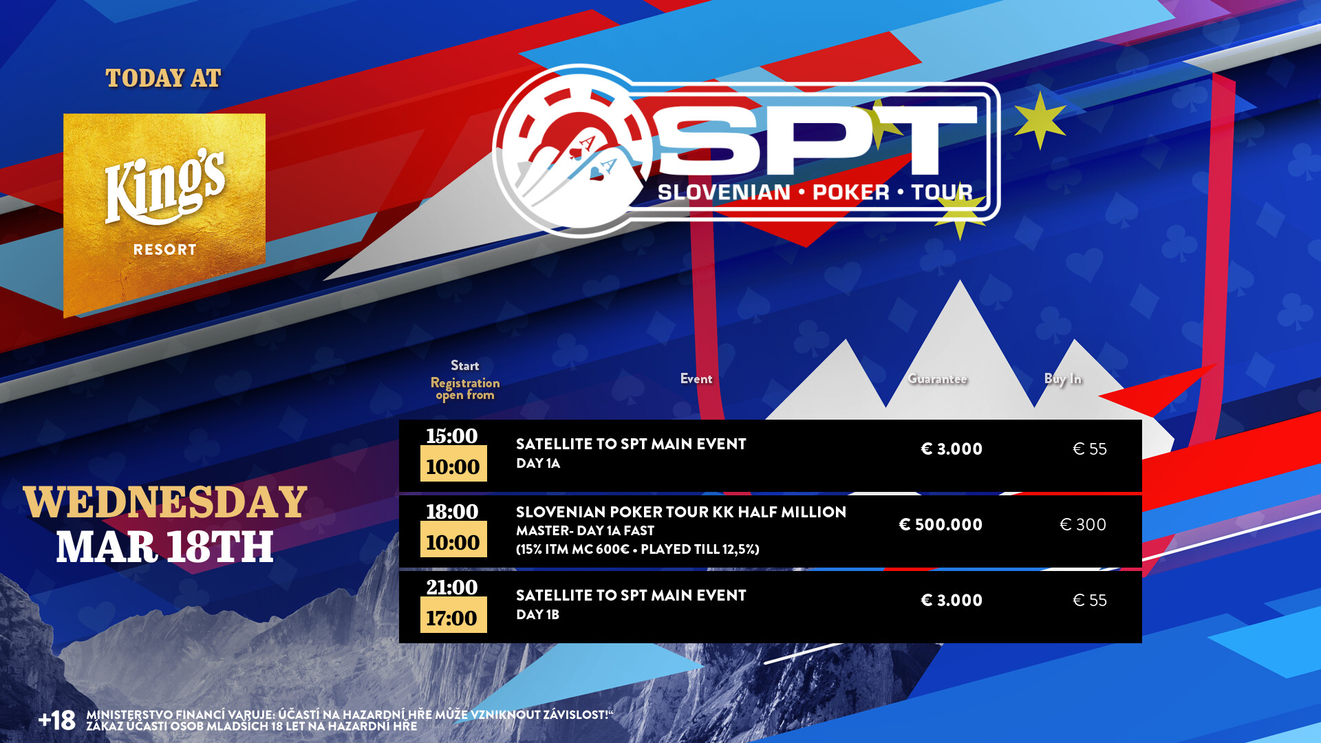 Das nächste Millionenturnier kommt schon wieder im April, jetzt aber startet die Slovenian Poker Tour KK Half Million. Beim € 3000 Main Event wird heute mit 50.000 Chips und 30 Minuten Levels gestartet. Die top 15 % kommen ins Geld (€ 600 Min-Cash), die top 12,5 % qualifizieren sich für Tag 2 am Sonntag. € 500.000 Preisgeld (inkl. 10 x € 3k King’s Million EPC Packages) sind garantiert. Die Cash Games starten wie immer ab den Blinds € 1/2 NLH bzw. € 2/2 PLO. Alle Informationen zum kompletten Angebot findet Ihr unter kings-resort.com.