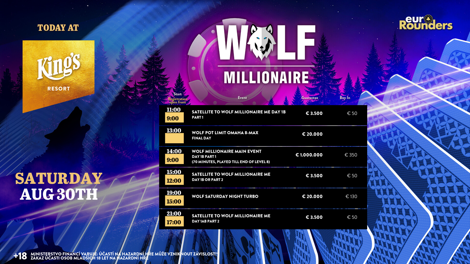 € 1.000.000 Preisgeld (inkl. 10 x € 10.350 WSOPE Main Event Tickets) warten beim € 350 Wolf Millionaire im King’s Resort Rozvadov. Mit dem ersten langsamen Flight 1A und einem Speed Flight im King’s Prague wurde gestern, den 29. August, das Turnier eröffnet.