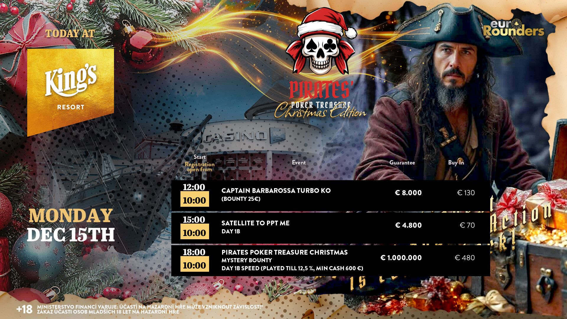 Zwei Festivals gibt es 2026 noch im King’s Resort Rozvadov. Gestern, den 14. Dezember, wurde das letzte Millionen Festival, das € 330 + 150 Pirates Poker Treasure Mystery Bounty der Eurorounders (€ 1.000.000 GTD inkl. 10 x € 3k King’s Million EPC Packages) eröffnet.