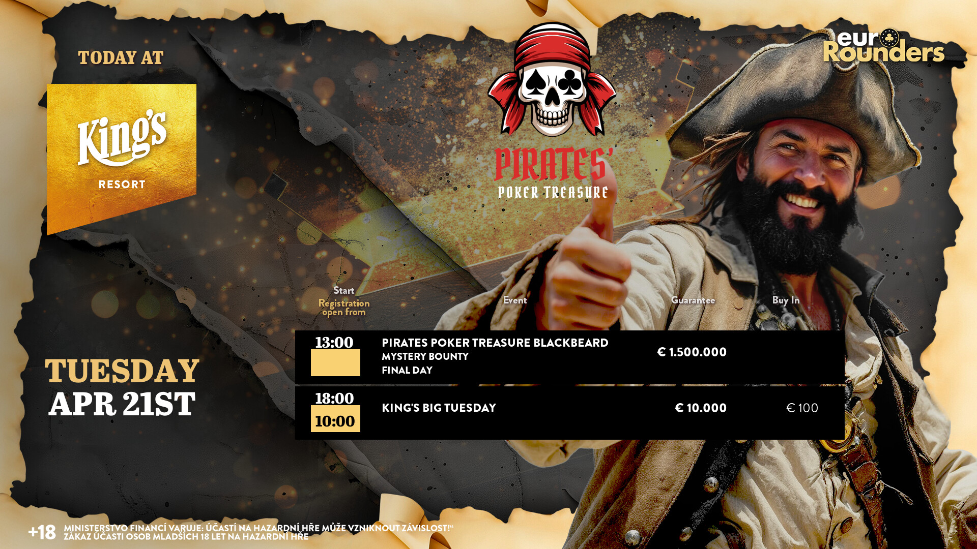 Ein Deal entschied das € 1.000 Captain Morgan High Roller (€ 100.000 GTD) beim Pirates Poker Treasure Festival im King’s Resort Rozvadov. Nach einem Deal der letzten drei Spieler holte Lucky888 den Sieg, Gerhard Brimmers kam auf Rang 3.