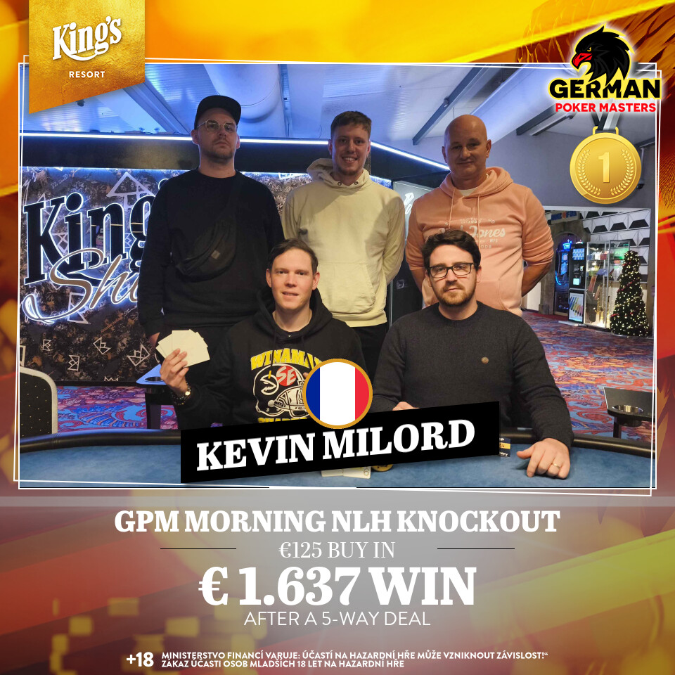 Mit dem € 100 + 25 GPM Morning Knockout wurde gestern, den 24. November, im King’s Resort Rozvadov der Tag eröffnet, ein Deal brachte Kevin Milord den Sieg.
