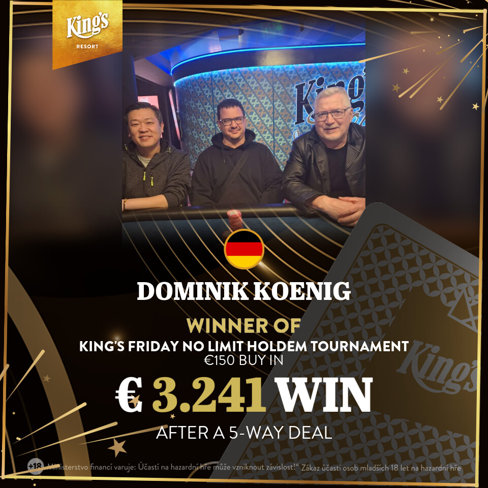 Heute stehen erneut zwei Flights bei der € 250 German Poker Masters Easter Edition (€ 500.000 GTD inkl. 5 x € 10.350 WSOPE Main Event Tickets) an, außerdem gibt es das € 100 GPM Ladies (€ 2.000 GTD/20k/20′) und das € 150 Saturday NLH (€ 10.000 GTD/20k/15′). Die Cash Games werden wie immer ab den Blinds € 1/2 NLH bzw. € 2/2 PLO angeboten. Alle Infos zum kompletten Angebot findet Ihr unter kings-resort.com.