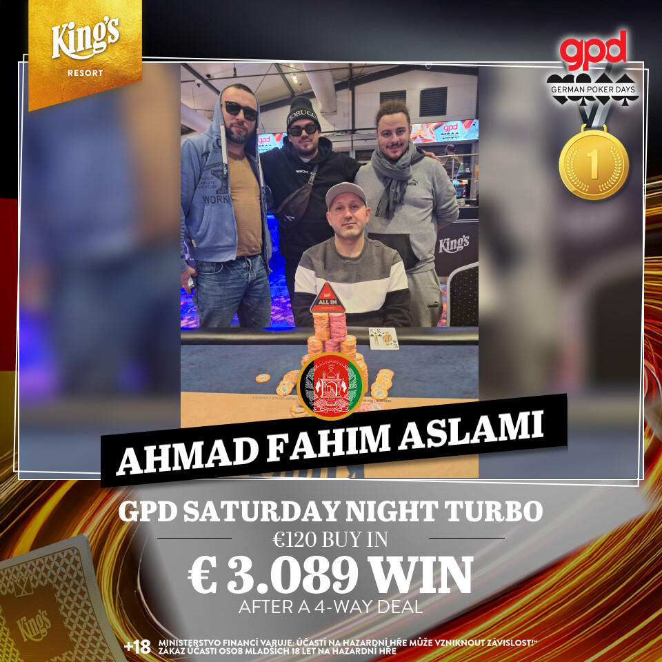 Beim € 120 Saturday Night Turbo warteten € 15.000 Preisgeld, auch hier wurde mit 15.000 Chips und 15 Minuten Levels gespielt. 125 Spieler gingen an den Start, 39 mal wurde nachgekauft und so waren nach Abzug der 16 % Fee € 16.531 im Pot. Die top 23 Plätze waren bezahlt, € 3.844 lagen für den Sieger bereit. Die letzten vier konnten sich hier aber auch einigen, Ahmad Fahim Aslami holte den Sieg für € 3.089.