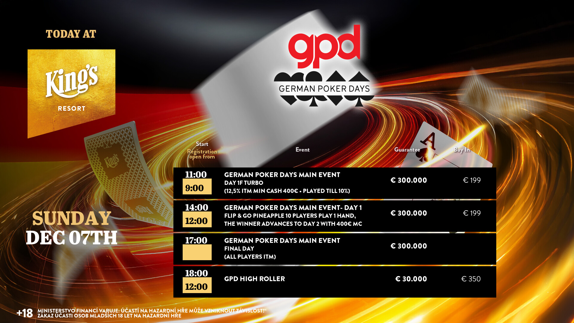 Auch gestern, den 6. Dezember, konnte die Garantiesummen bei den Side Events der German Poker Days im King’s Resort Rozvadov wieder locker übertroffen werden. Sowohl das € 120 Omaha als auch das € 120 Saturday Night Turbo wurde durch einen Deal beendet.