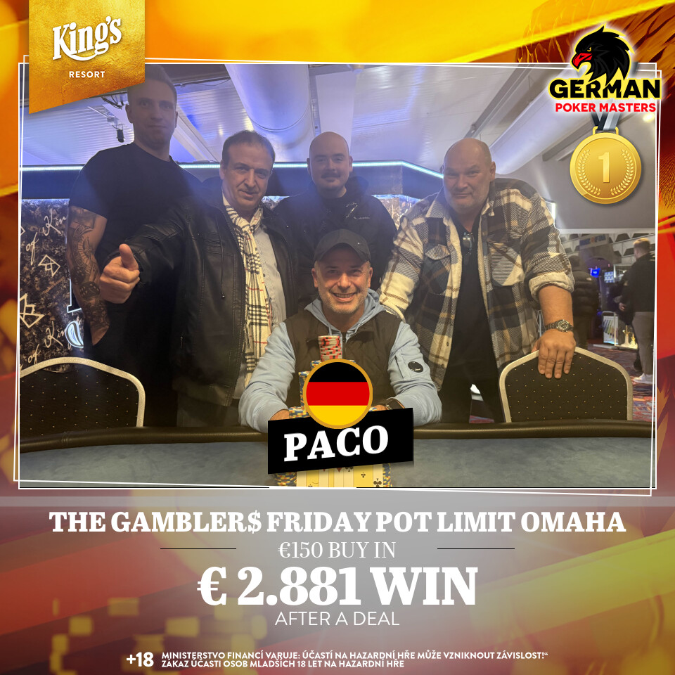 Auch das € 150 The Gambler$ Friday PLO übertraf mit 116 Startern und 47 Re-Entries locker die € 10.000 Garantie. Mit 20.000 Chips und 15 Minuten Levels wurde gespielt, nach Abzug der 16% Fee ging es um 23 bezahlte Plätze. Der Sieger konnte sich auf € 4.777 freuen, die letzten sechs aber konnten sich einigen. Dabei gingen € 2.881 an den Sieger PACO, chiKKita banAAna nahm als Zweiter noch € 2.769 mit.