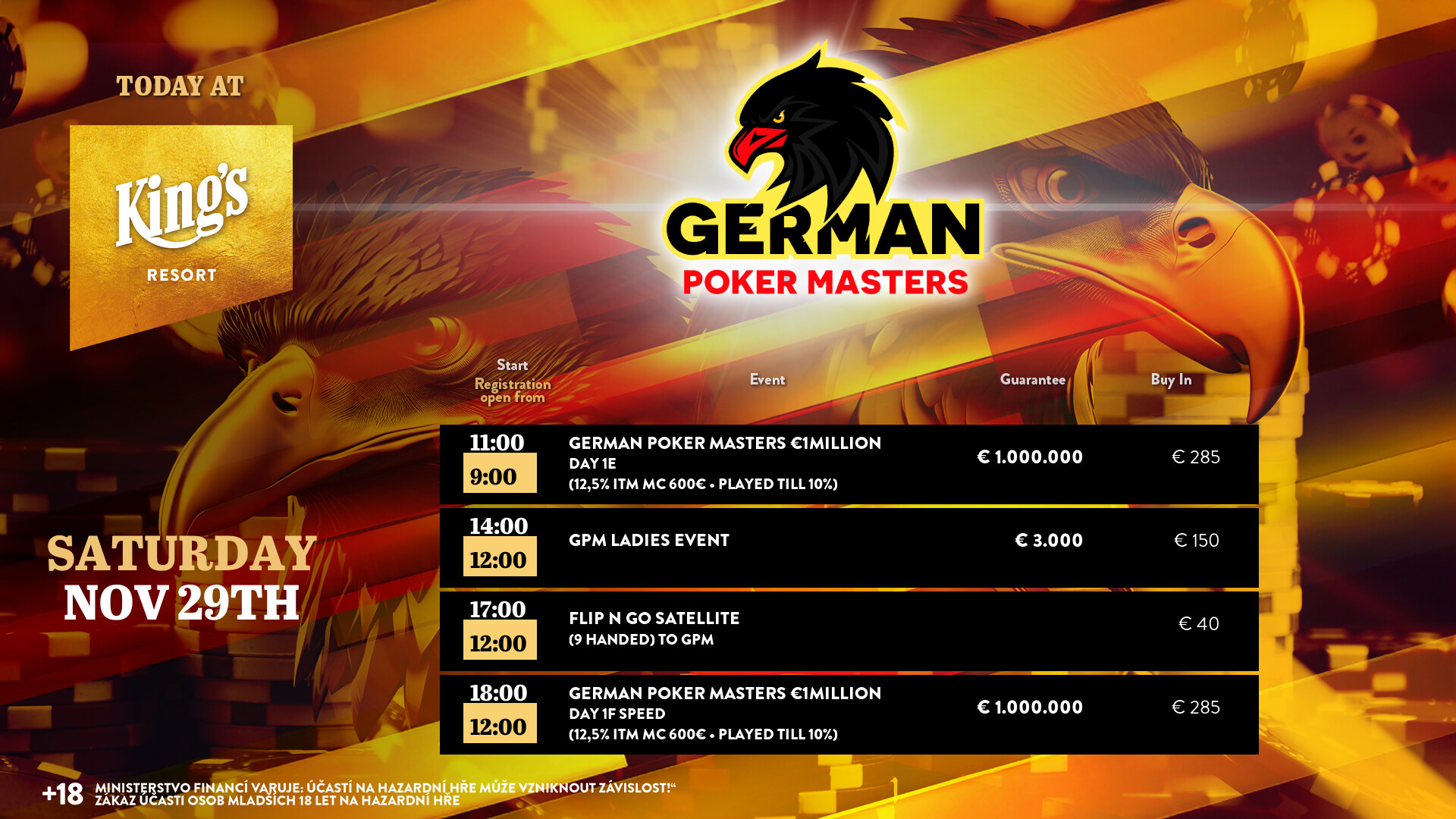 Heute dreht sich alles um das € 285 German Poker Masters Million Main Event (€ 1.000.000 GTD inkl. 10 x 3k King’s Million EPC Packages). Tag 1E wird mit 50.000 Chips und 40 Minuten Levels gespielt, Tag 2 hat 30 Minuten Levels. Die Cash Games starten wie gewohnt ab den Blinds € 1/2 NLH bzw. € 2/2 PLO wird gespielt. Alle Infos zum kompletten Angebot findet Ihr unter kings-resort.com.