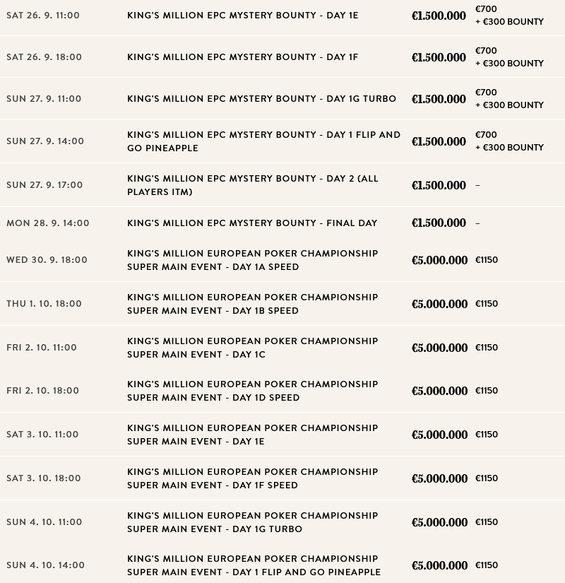 – € 700 + 300 King’s Million EPC Mystery Bounty (€ 1.500.000 GTD) – 23. – 28. September