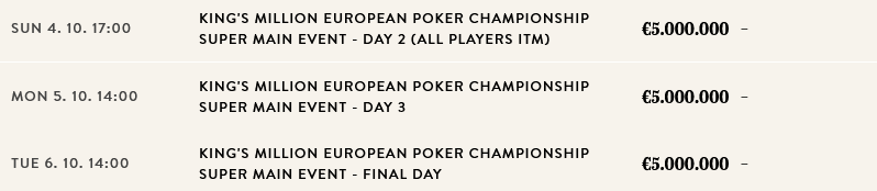 – € 1.150 King’s Million EPC Super Main Event (€ 5.000.000 GTD) – 30. September – 6. Oktober