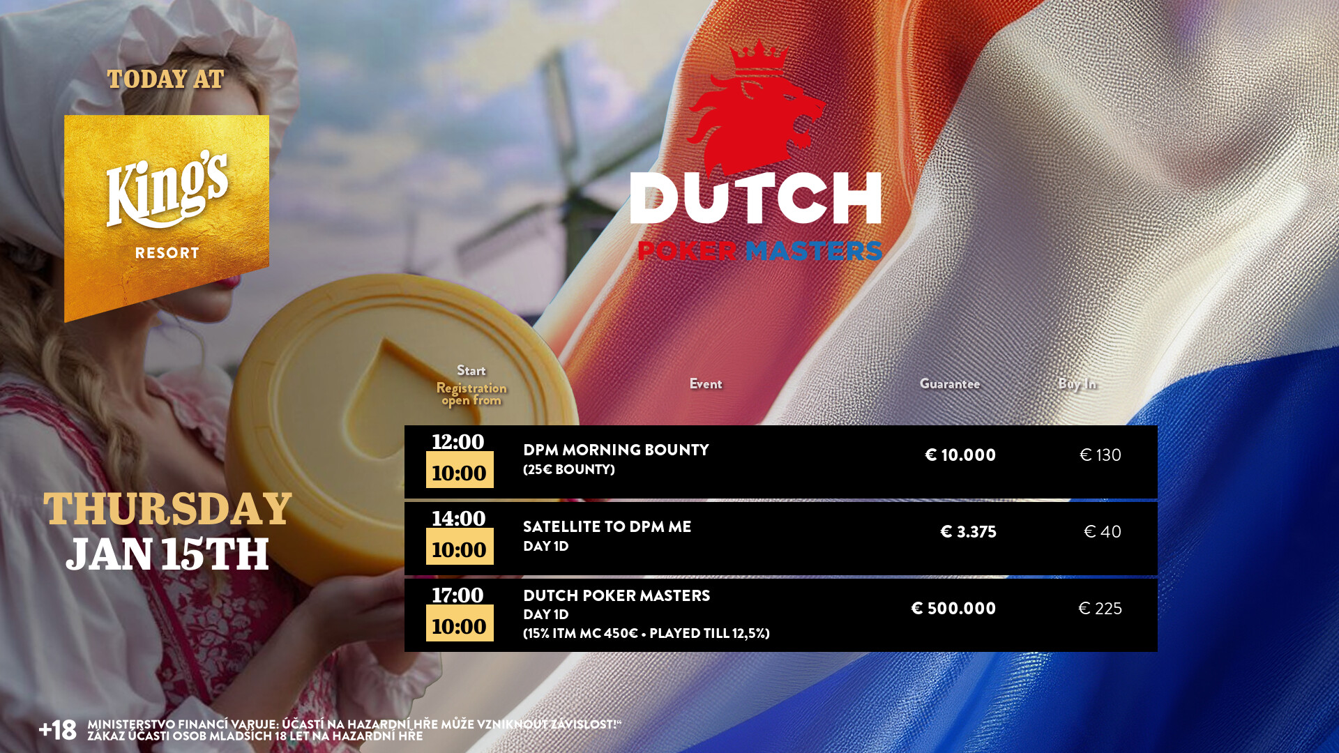 Der dritte Flight bei den € 225 Dutch Poker Masters (€ 500.000 GTD inkl. 10 x € 3k King’s Million EPC Packages) im King’s Resort Rozvadov brachte gestern, den 14. Januar, ein Double-up der Zahlen, Jiri Heidtke ist der erste Chipsmillionär.