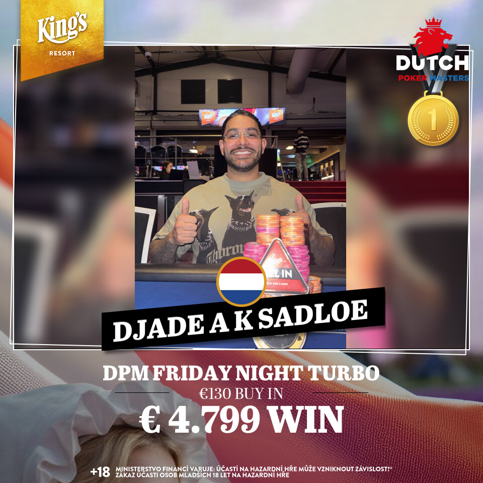 Zwei weitere Flights Flights bei den € 225 Dutch Poker Masters (€ 500.000 GTD inkl. 10 x € 3k King’s Million EPC Packages) stehen heute an, dazu kommen das € 120 PLO (€ 8.000 GTD/15k/15′) und das € 130 Saturday Night Turbo (€ 10.000 GTD/15k/15′). Die Cash Games starten wie gewohnt ab den Blinds € 1/2 NLH bzw. € 2/2 PLO. Alle Infos zum kompletten Angebot findet Ihr unter kings-resort.com.