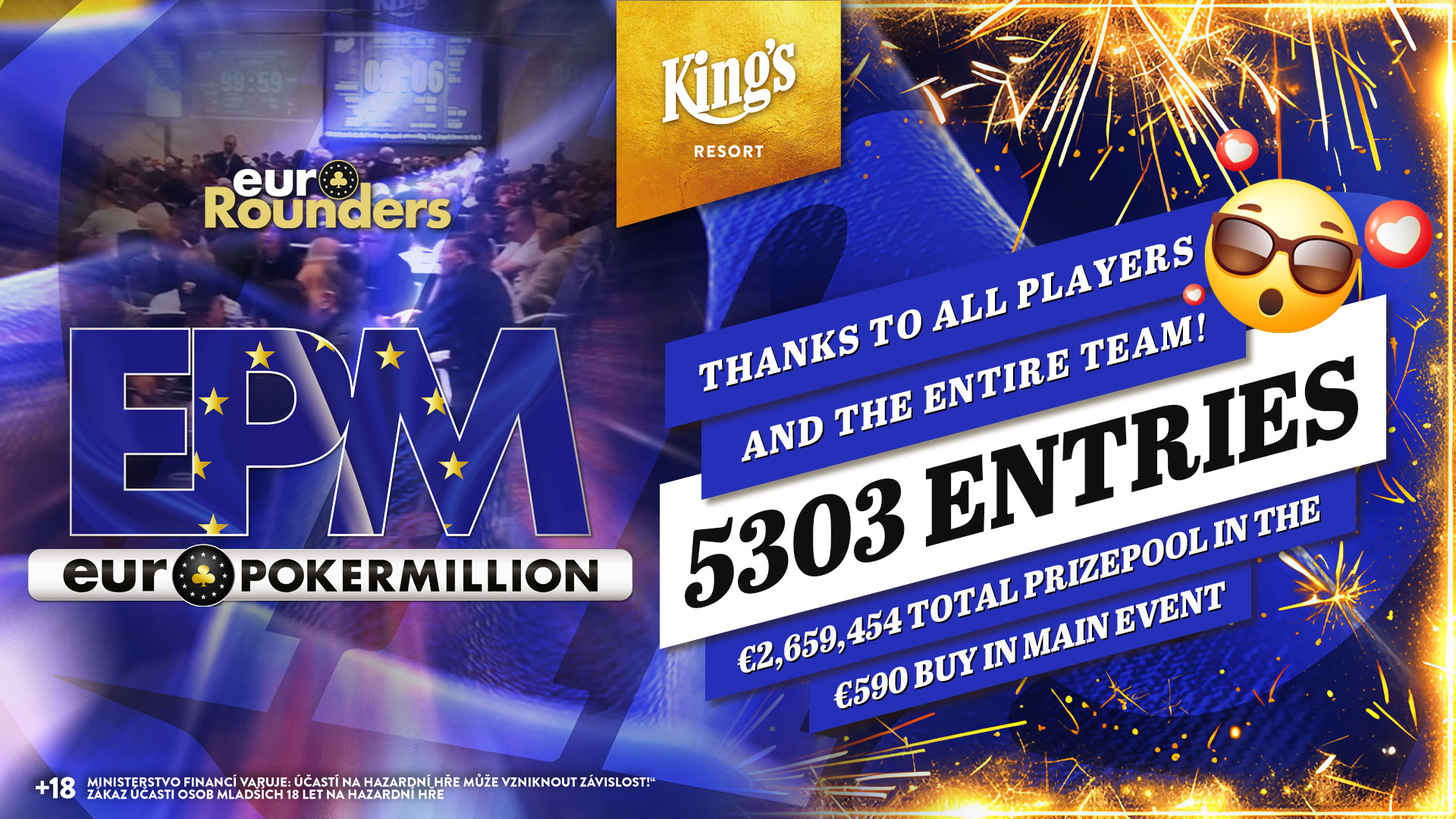 Schon nach den regulären Flights beim € 590 Main Event des Euro Poker Million Festivals powered by Eurorounders im King’s Resort Rozvadov war die € 2.000.000 Garantie geknackt gewesen, insgesamt kam man auf 5.313 Entries und damit € 2.659.454 Preispool.