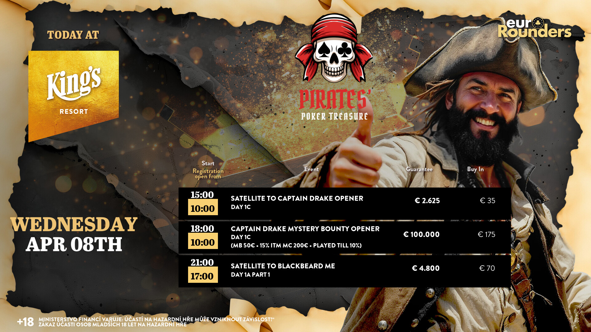 Auch der zweite Flight beim € 125 + 50 Captain Drake Mystery Bounty Opener (€ 100.000 GTD) gestern, den 7. April, im King’s Resort Rozvadov brachte nur eine kleine Runde. Heute und morgen kann man aber noch antreten und auf Bountyjagd gehen.