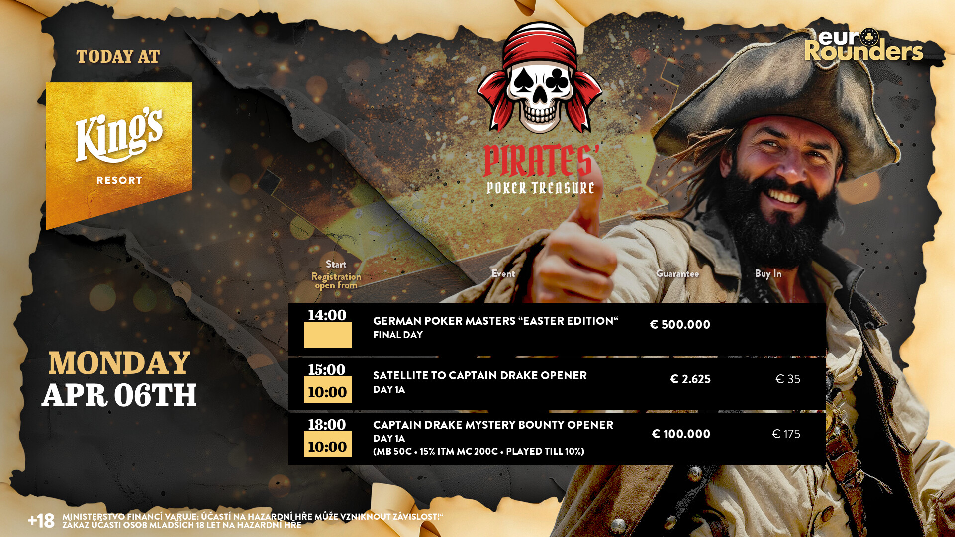 Während die Entscheidung bei den German Poker Masters fällt, wird dann schon das nächste Festival eröffnet. Eurorounders sind wieder da und feiern die große Piratenparty. Eröffnet wird mit dem € 125 + 50 Captain Drake Mystery Bounty Opener (€ 100.000 GTD). Gespielt wird mit 40.000 Chips und 30 Minuten Levels, die top 15 % kommen ins Geld (€ 200 Min-Cash), die top 10 % kommen ins Finale am Donnerstag. Die Cash Games starten wie immer ab den Blinds € 1/2 NLH bzw. € 2/2 PLO. Alle Informationen zum kompletten Angebot findet Ihr unter kings-resort.com.
