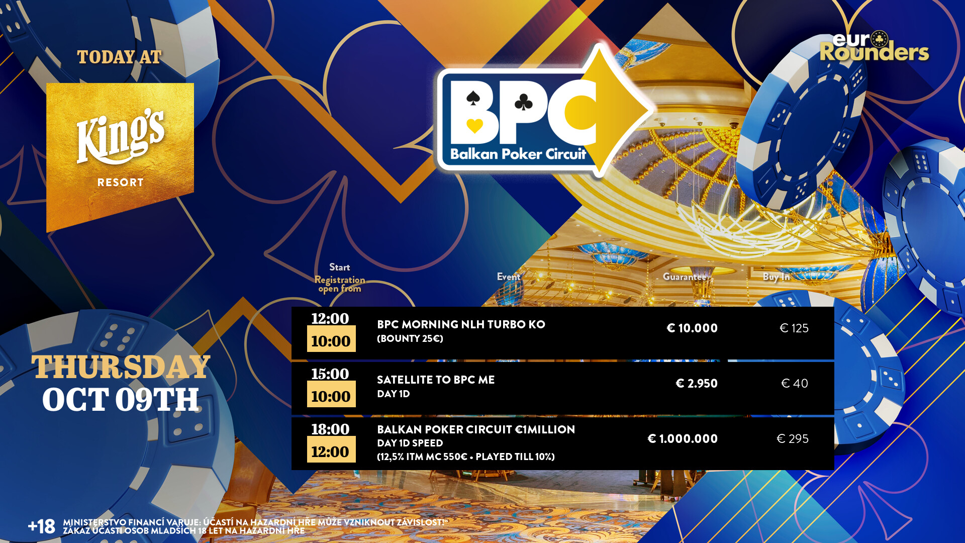 Tag 1D startet heute um 18 Uhr zu denselben Konditionen, dazu kommt aber das € 100 + 25 Morning Knockout (€ 10.000 GTD/15k/15′). Ab heute darf man schon mit deutlich mehr Spielern rechnen, am Wochenende kommen Eurorounders wieder mit vielen Italienern. Die Cash Games starten wie gewohnt ab den Blinds € 1/2 NLH bzw. € 2/2 PLO wird gespielt. Alle Infos zum kompletten Angebot findet Ihr unter kings-resort.com.