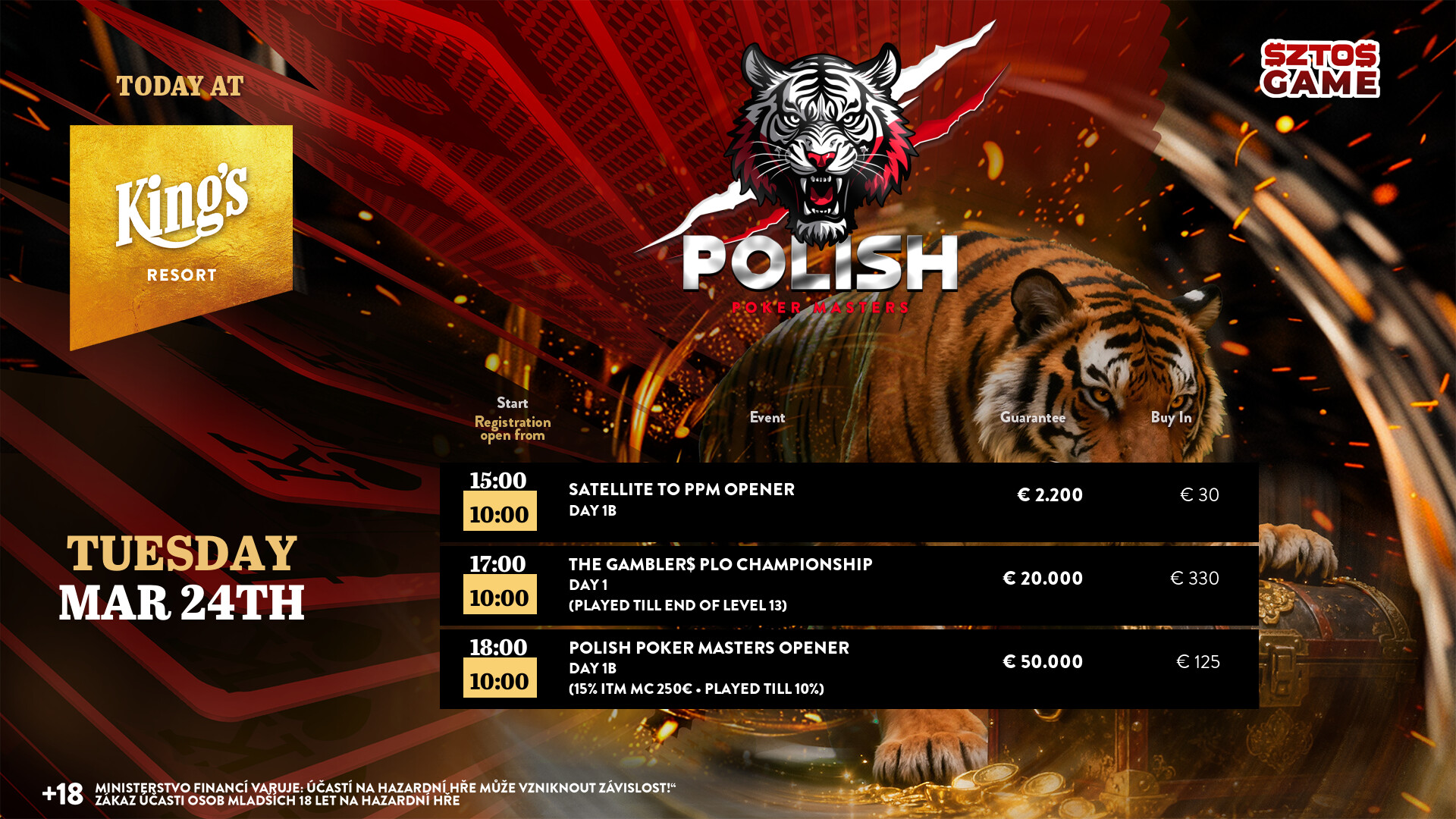 Parallel zum Finale fiel gestern schon der Startschuss zum € 125 Polish Poker Masters Opener (€ 50.000 GTD/40k/30′). Heute geht es in Tag 1B, die top 15 % kommen wieder ins Geld, die top 10 % erreichen das Finale. Auch die € 330 The Gamblers PLO Championship (€ 20.000 GTD/40k/40′) wird heute gestartet. 13 Levels werden heute gespielt, das Finale folgt morgen. Die Cash Games starten wie immer ab den Blinds € 1/2 NLH bzw. € 2/2 PLO. Alle Informationen zum kompletten Angebot findet Ihr unter kings-resort.com.