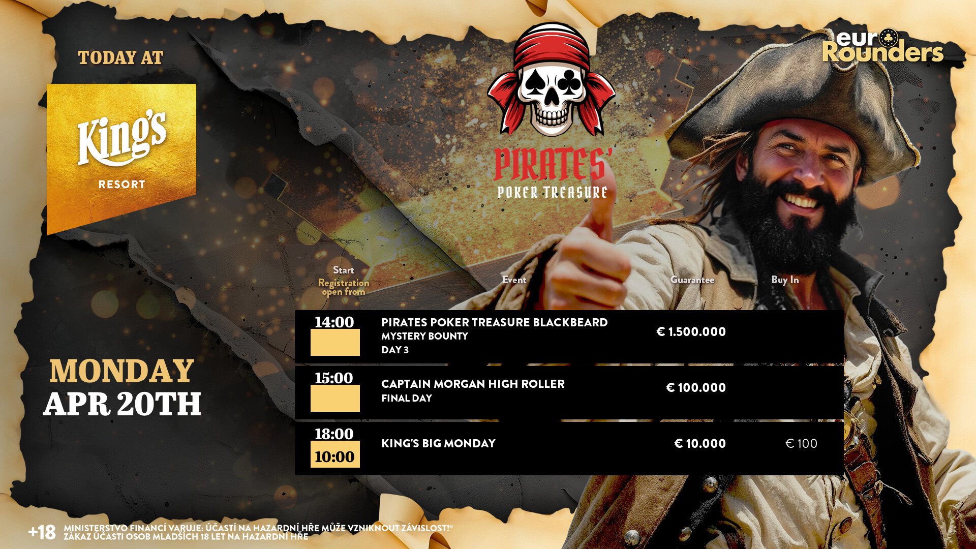 Starke Zahlen lieferte das € 1.000 Captain Morgan High Roller (€ 100.000 GTD) beim Pirates Poker Treasure Festival im King’s Resort Rozvadov. Gerhard Brimmers führt heute im Finale, wo auf den Sieger € 40.700 warten.