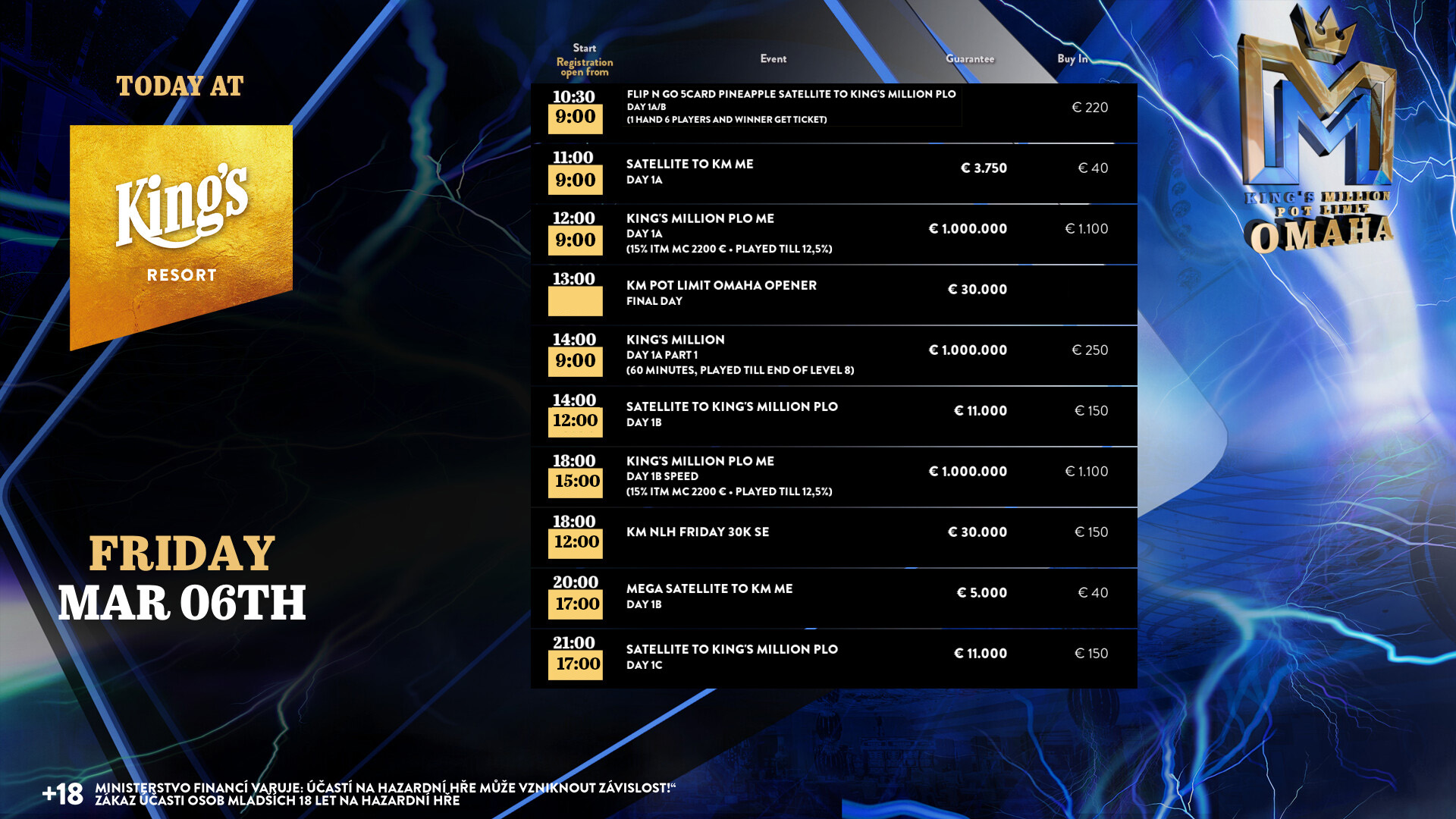Da sind zunächst Tag 1A und Tag 1B Speed beim € 1.100 King’s Million PLO (€ 1.000.000 GTD). Gespielt wird mit 50.000 Chips und 40 (30′) Minuten Levels, die top 15 % kommen ins Geld (€ 2.200 Min-Cash), die top 12,5 % qualifizieren sich für Tag 2.