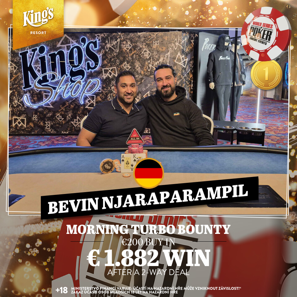 Das € 100 + 100 Morning Turbo Bounty Side Event beim WSOP Circuit im King’s Resort Rozvadov wurde gestern, den 8. Januar, durch einen Deal entschieden, Bevin Joseph Njaraparampil und Basim Kalam teilten im Heads-up.