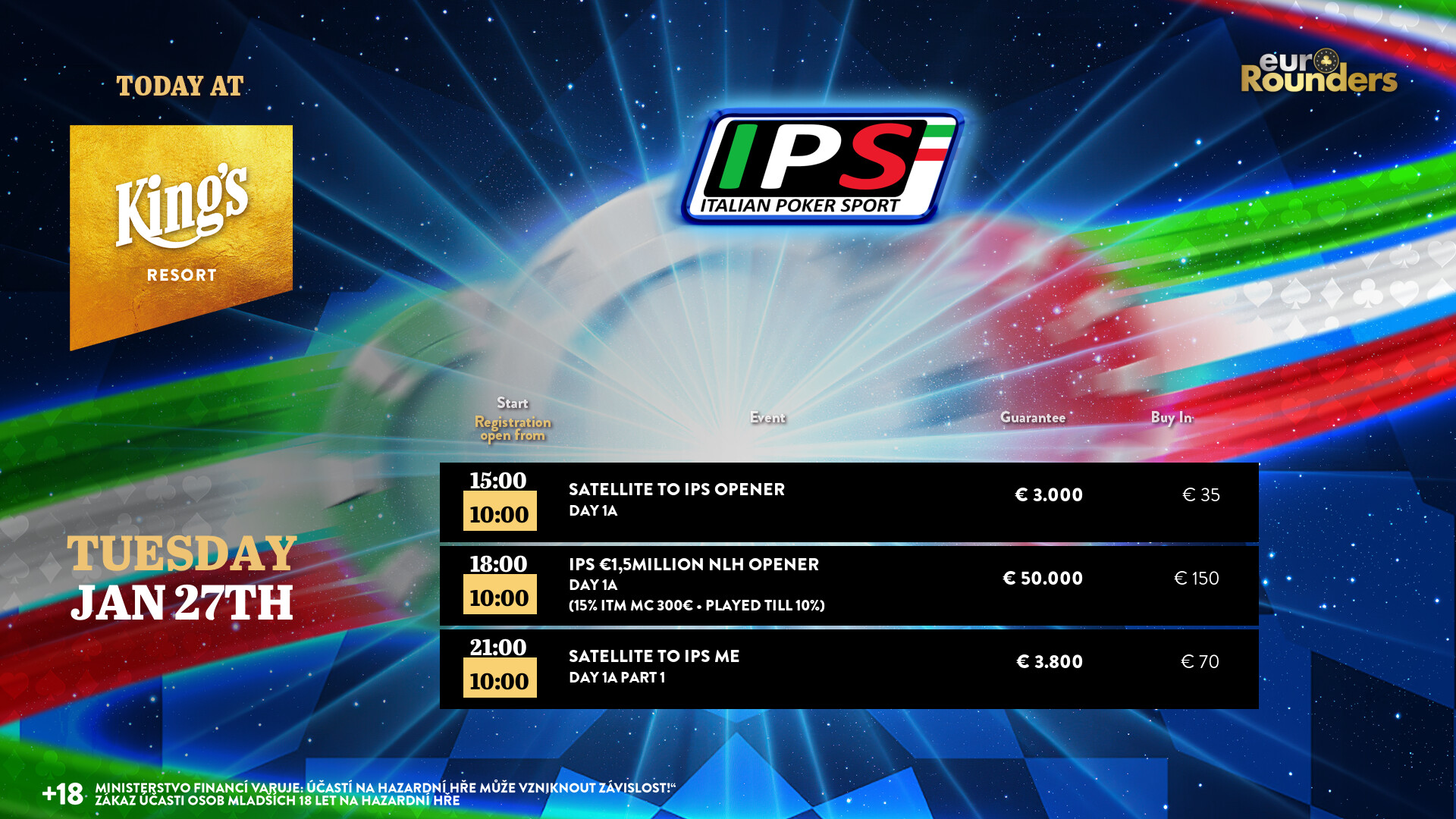 Mit dem € 150 Opener (€ 50.000 GTD) wird heute das Italian Poker Sport (IPS) eröffnet, es gibt 40.000 Chips und 30 Minuten Levels. Zwei reguläre Flights heute und morgen werden angeboten, am Donnerstag gibt es vor dem Finale noch den Turbo Flight. Die Cash Games starten wie gewohnt ab den Blinds € 1/2 NLH bzw. € 2/2 PLO. Alle Informationen zum kompletten Angebot findet Ihr unter kings-resort.com.