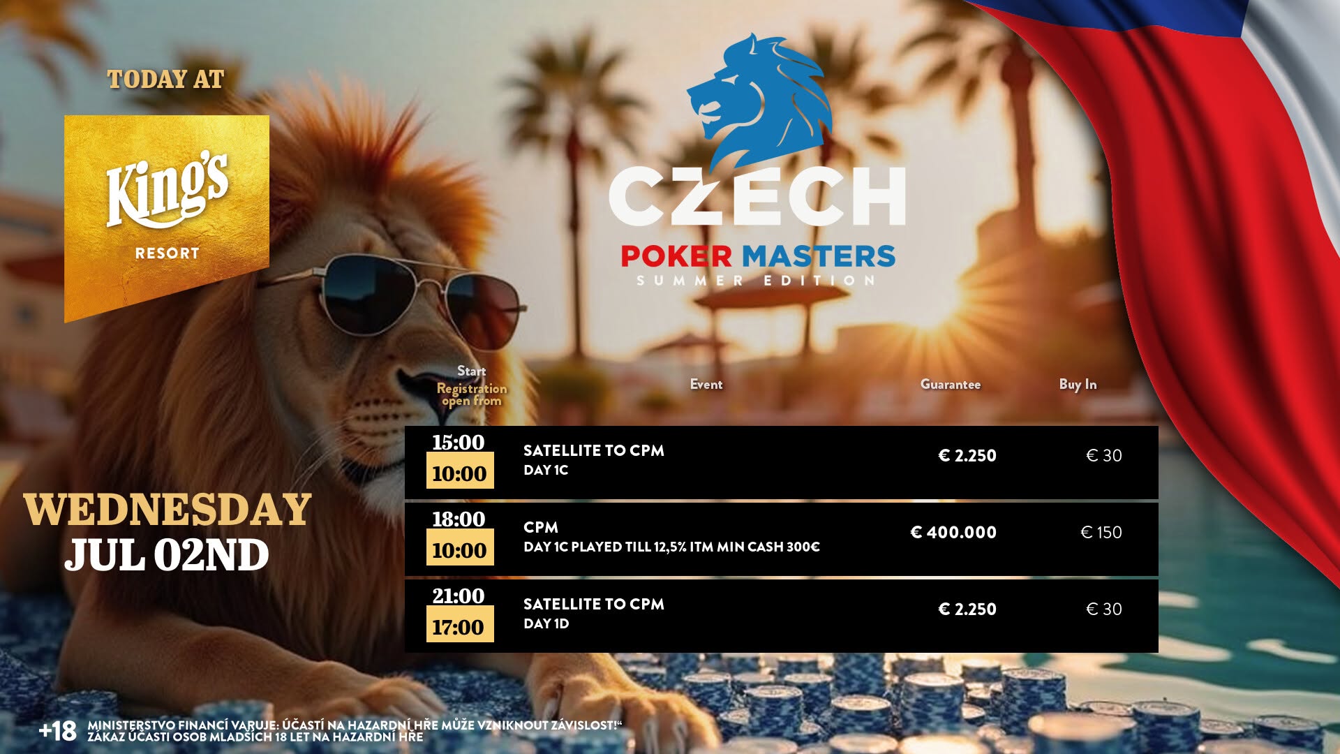 Der zweite Flight bei der € 150 Czech Poker Masters Summer Edition (€ 400.000 GTD inkl. 4 x € 10.350 WSOPE Main Event Tickets) im King’s Resort Rozvadov brachte gestern, den 1. Juli, ein international besetztes Feld und die Führung für Ruel Tristepin.