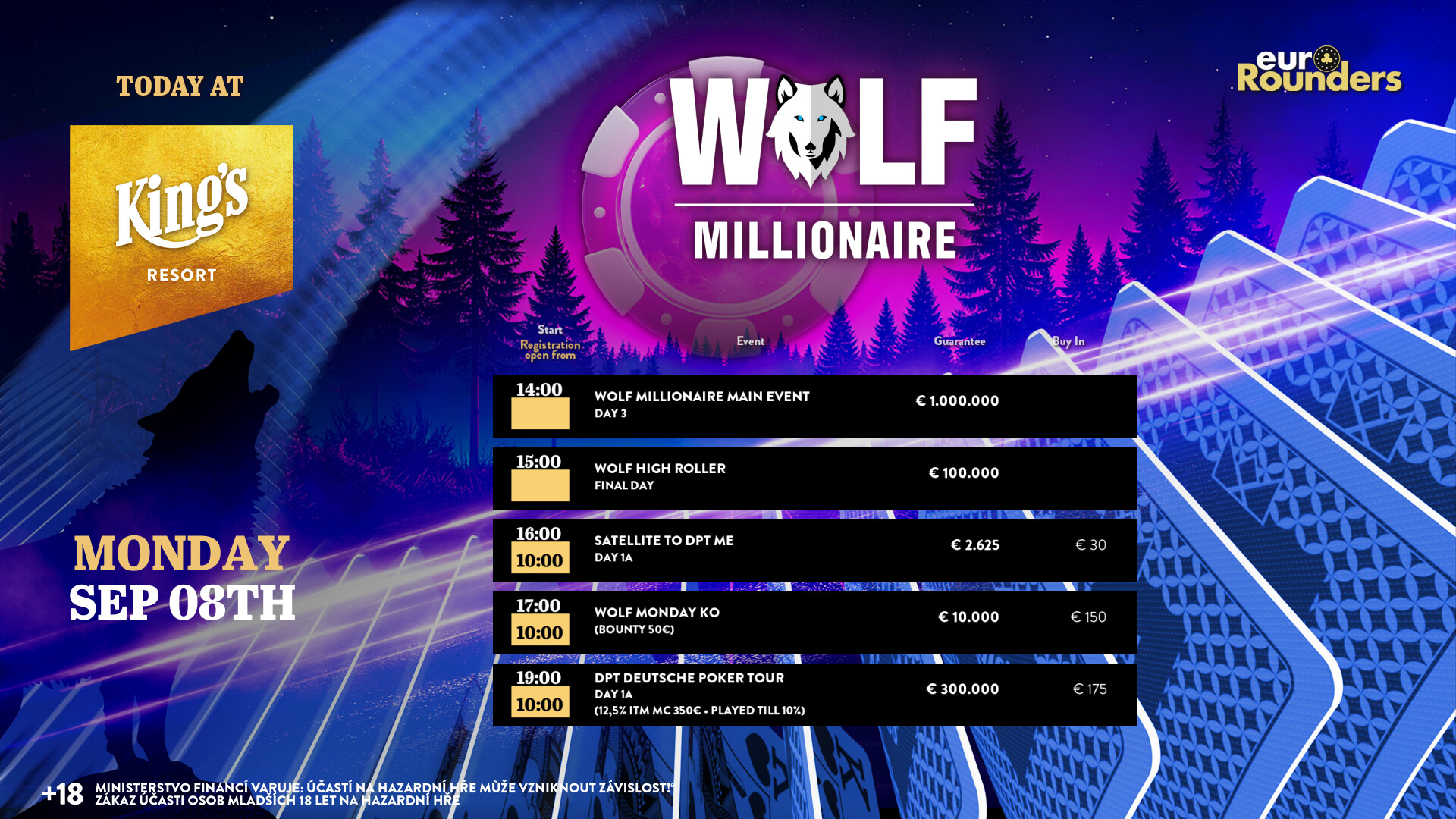 Bei den Blinds 25k/50k/50k geht es um 14 Uhr weiter, die Leveldauer beträgt weiter 70 Minuten. Natürlich gibt es auch heute wieder den Livestream (ab 14.30 Uhr). Als Side Event gibt es das € 100 + 50 Wolf Monday Knockout (€ 10.000 GTD/20k/20′), aber es fällt auch bereits der Startschuss zum € 175 DPT Deutsche Poker Tour Main Event (€ 300.000 GTD inkl. 3 x € 10.350 WSOPE Main Event Tickets). Es wird mit 40.000 Chips und 30 Minuten Levels bis 10 % der Entries (ITM 12,5 % der Entries/Min Cash € 350) gespielt. Die Cash Games werden wie immer ab den Blinds € 1/2 NLH bzw. € 2/2 PLO angeboten. Alle Infos zum kompletten Angebot findet Ihr unter kings-resort.com.