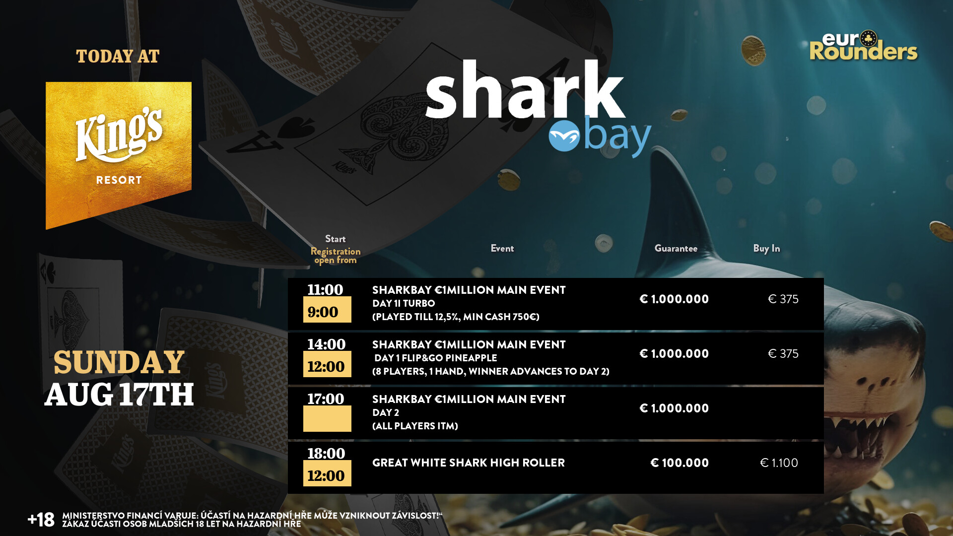 Locker sollte man heute beim € 375 Sharkbay Million im King’s Resort Rozvadov die Millionengarantie noch knacken, es gibt heute noch den Turbo Flight und die Flips, ehe es dann gleich für alle verbliebenen Spieler in Tag 2 geht.