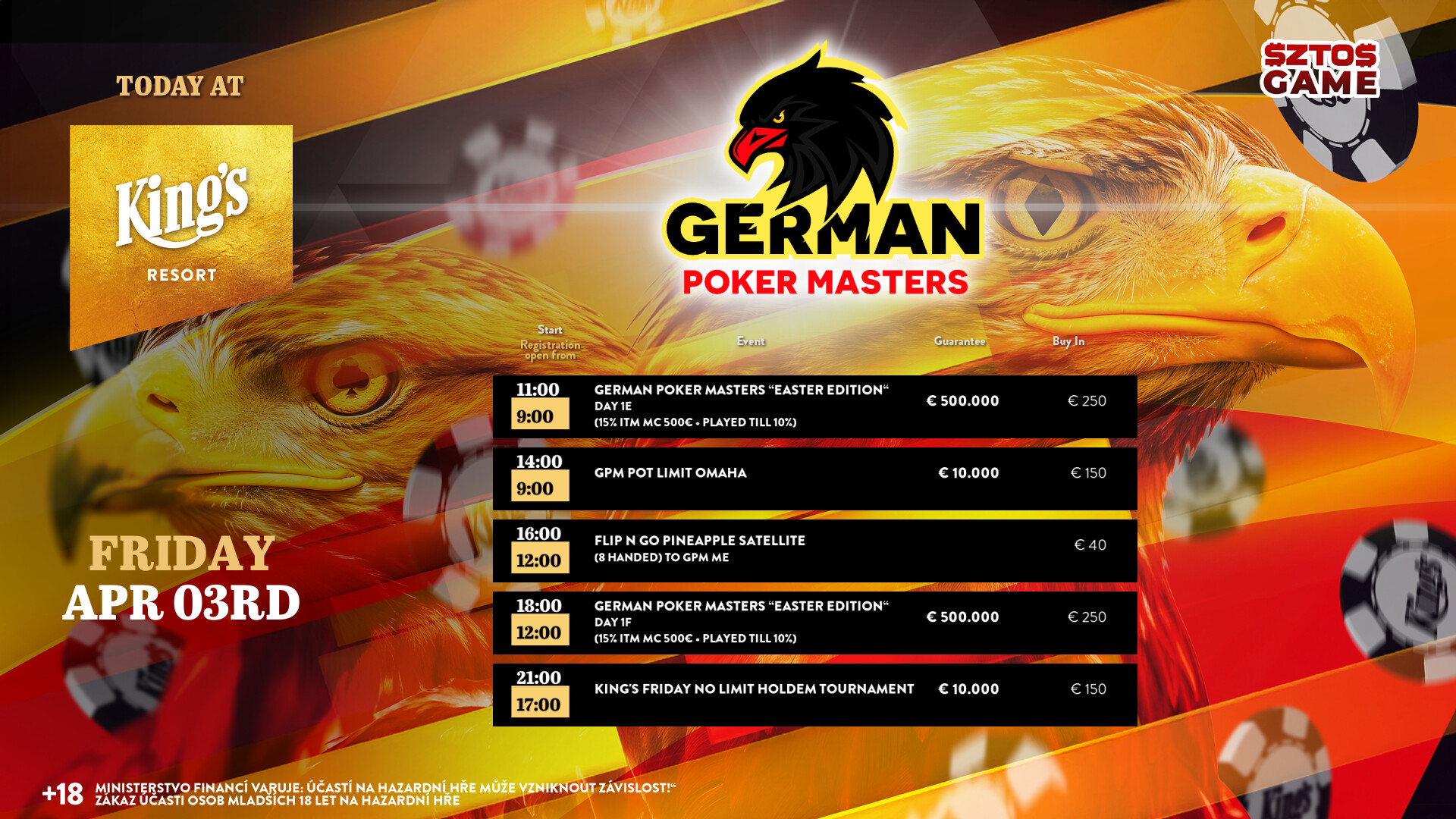 Heute geht es bereits um 11 Uhr in Tag 1E, der mit 40 Minuten Levels gespielt wird, am Abend startet 1F dann wieder mit 30 Minuten Levels. Als Side Events gibt es das € 150 PLO (€ 10.000 GTD/20k/15′) und das € 150 Friday NLH (€ 10.000 GTD/20k/15′). Die Cash Games starten wie immer ab den Blinds € 1/2 NLH bzw. € 2/2 PLO. Alle Informationen zum kompletten Angebot findet Ihr unter kings-resort.com.