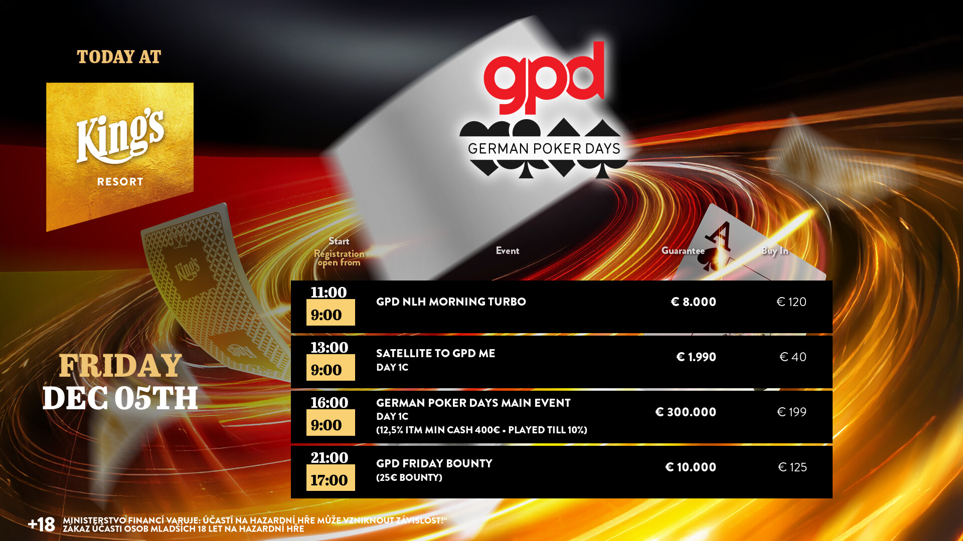 Heute gibt es Tag 1C, dazu kommen aber auch das € 120 Morning Turbo (€ 8.000 GTD/15k/15′) und das € 100 + 25 Friday Bounty (€ 10.000 GTD/15k/15′). Die Cash Games starten wie gewohnt ab den Blinds € 1/2 NLH bzw. € 2/2 PLO wird gespielt. Alle Infos zum kompletten Angebot findet Ihr unter kings-resort.com.