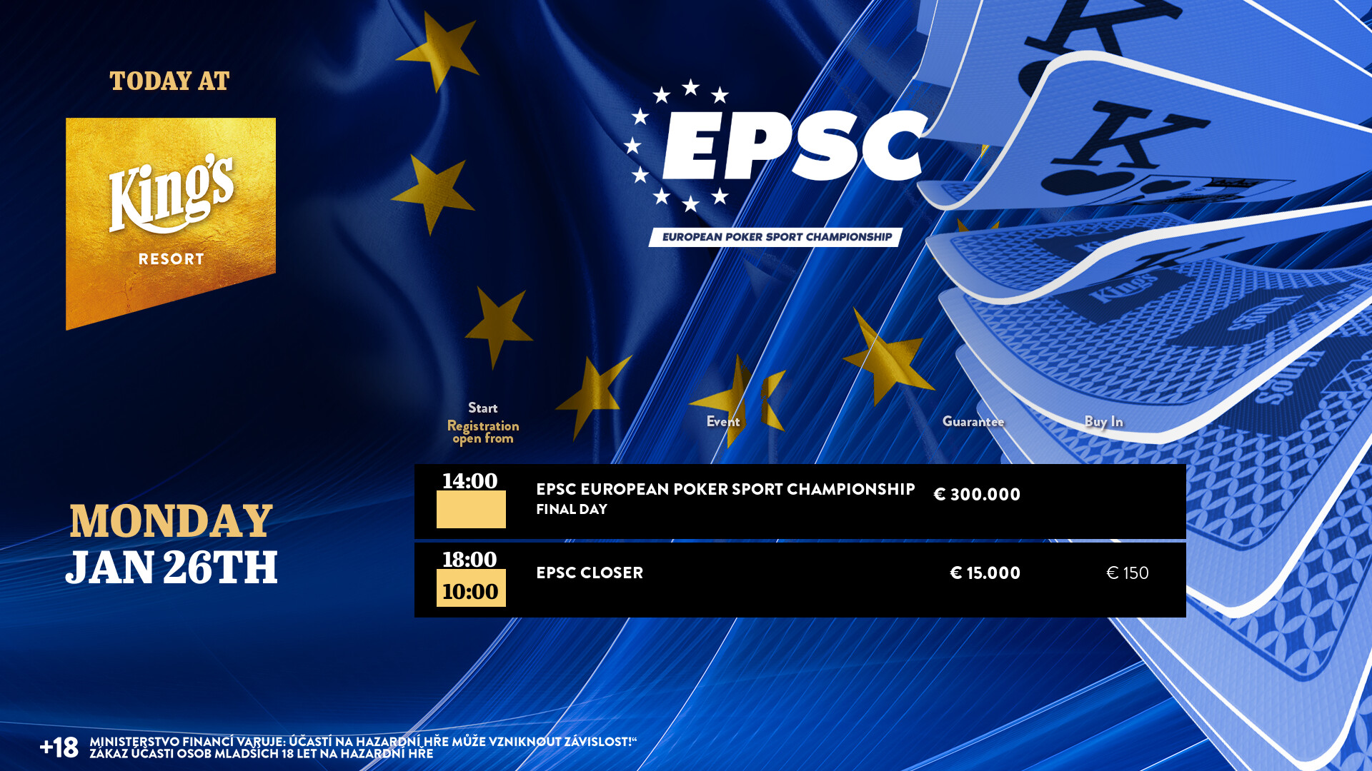 Neben dem EPSC Main Event Finale gibt es heute noch das € 150 EPSC Closer (€ 15.000 GTD/20k/20′), die Cash Games starten wie gewohnt ab den Blinds € 1/2 NLH bzw. € 2/2 PLO. Alle Informationen zum kompletten Angebot findet Ihr unter kings-resort.com.