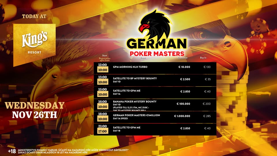 Heute geht es nicht in Tag 1D beim € 150 + 50 Banana Mystery (€ 100.000 GTD/50k/30′). Zudem wird mit dem 130 GPM NLH Morning Turbo (€ 10.000 GTD/15k/15′) der Tag eröffnet, um 18 Uhr wird auch der erste Heat bei der € 285 German Poker Masters Million (€ 1.000.000 GTD inkl. 10 x € 3k King’s Million EPC Packages) gestartet. Es gibt 50.000 Chips und 30 Minuten Levels. Die Cash Games starten wie gewohnt ab den Blinds € 1/2 NLH bzw. € 2/2 PLO wird gespielt. Alle Infos zum kompletten Angebot findet Ihr unter kings-resort.com.