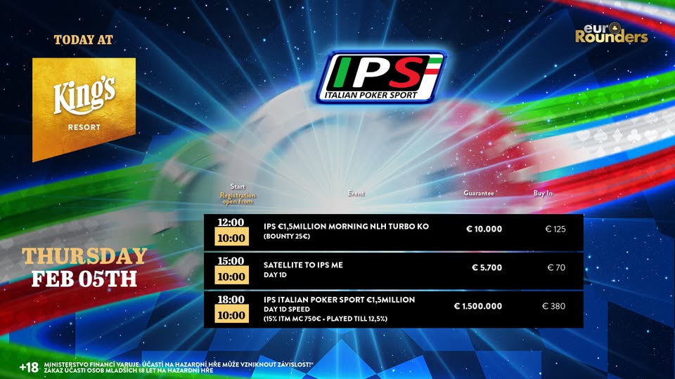 Ab heute steht das € 380 IPS Main Event (€ 1.500.000 GTD inkl. 15 x € 3k King’s Million EPC Packages) mit 50.000 Chips und 30 Minunte Levels im Mittelpunkt, der Tag wird aber mit dem € 100 + 25 Morning Turbo Bounty (€ 10.000 GTD/15k/15′) eröffnet. Die Cash Games starten wie gewohnt ab den Blinds € 1/2 NLH bzw. € 2/2 PLO. Alle Informationen zum kompletten Angebot findet Ihr unter kings-resort.com.