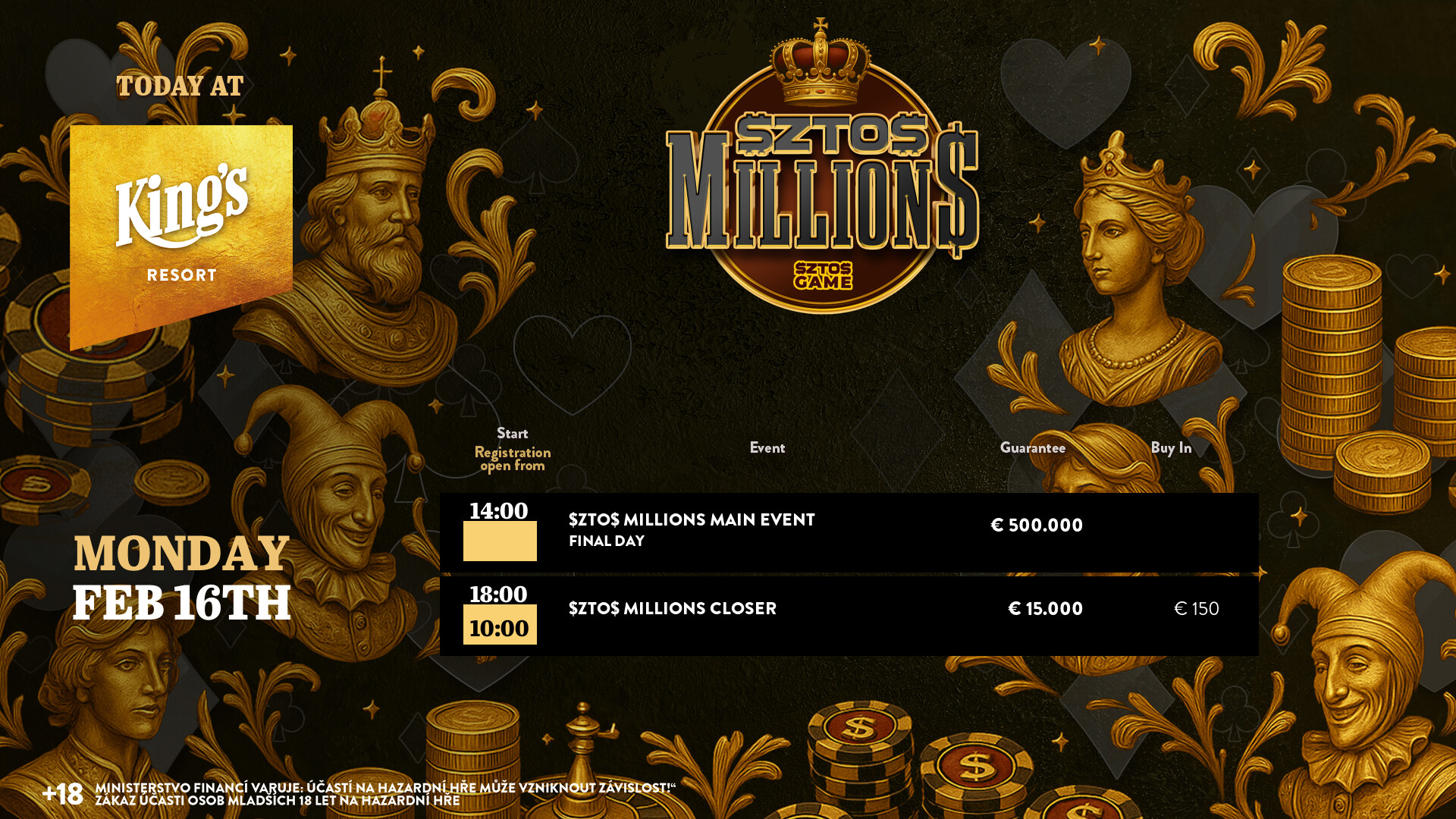 Heute ist Entscheidungstag beim $ZTO$ Main Event, zum Abschluss gibt es noch das € 150 Closer (€ 15.000 GTD/15k/15′). Die Cash Games starten wie gewohnt ab den Blinds € 1/2 NLH bzw. € 2/2 PLO. Alle Informationen zum kompletten Angebot findet Ihr unter kings-resort.com.