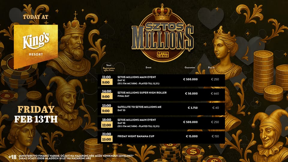 Heute geht es um 11 Uhr in den langsamen Tag 1C (40′), am Abend wird mit 30 Minuten auch im King’s Prag gespielt. Am Abend warten beim € 150 Friday Night Banana Cup € 15.000 (15k/15′). Die Cash Games starten wie gewohnt ab den Blinds € 1/2 NLH bzw. € 2/2 PLO. Alle Informationen zum kompletten Angebot findet Ihr unter kings-resort.com.