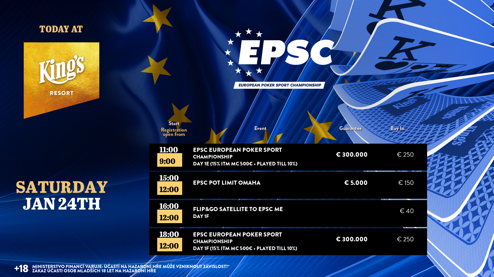 Heute gibt es die letzten beiden regulären Flights beim € 250 EPSC Main Event (€ 300.000 GTD inkl. 10 x 3k King’s Million EPC Packages), dazu sorgt am Nachmittag das € 150 PLO (€ 5.000 GTD/20k/15′) für Abwechslung. Die Cash Games starten wie gewohnt ab den Blinds € 1/2 NLH bzw. € 2/2 PLO. Alle Informationen zum kompletten Angebot findet Ihr unter kings-resort.com.