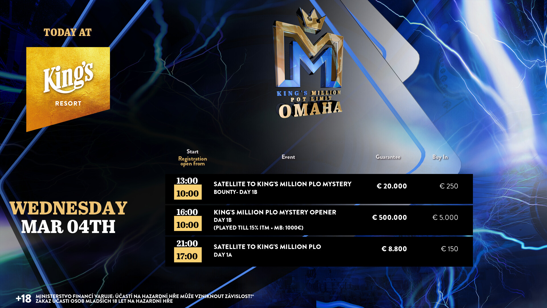 Kaum ist de Vamos Poker Tour im King’s Resort Rozvadov zu Ende, geht es schon ins nächste Festival. Gestern, den 3. März, wurde die Kiing’s Mllion PLO mit dem € 4.000 + 1.000 Mystery Bounty (€ 500.000 GTD) eröffnet.