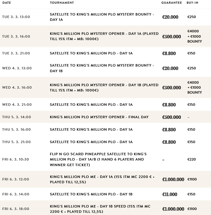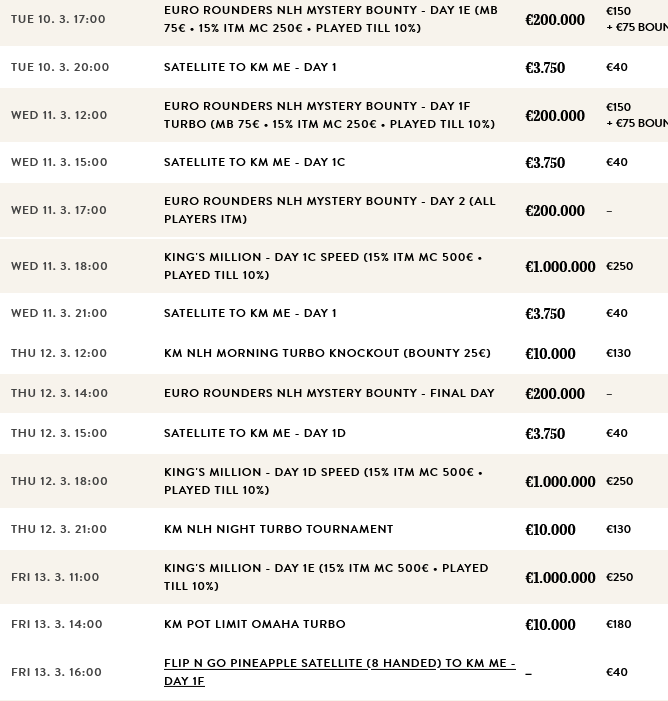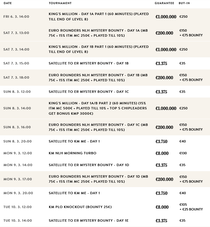 Anders als bei der PLO Ausgabe lockte die King’s Millon in der NLH Variante zahlreiche Spieler an und sorgte für mehr als € 1.500.000 im Pot. Auch bei dieser Ausgabe darf man mit vielen Spielern an den Tischen rechnen, denn das Buy-In ist mit € 250 neuerlich sehr niedrig. Eröffnet wird das Wochenende schon mit dem € 150 + 75 Mystery Bounty (€ 200.000 GTD), dazu kommen die langsamen ersten Flights der King’s Million selbst. Auch dieses Mal gibt es wieder verschiedene Levelzeiten für jeden Geschmack. Am Sonntag, den 15. März, geht es mit 60 Minuten Levels in Tag 2, auch Tag 3 und das Finale werden dann mit 60 Minuten Levels gespielt. Zum Main Event kommen noch einige Side Events, die für Abwechslung sorgen.
