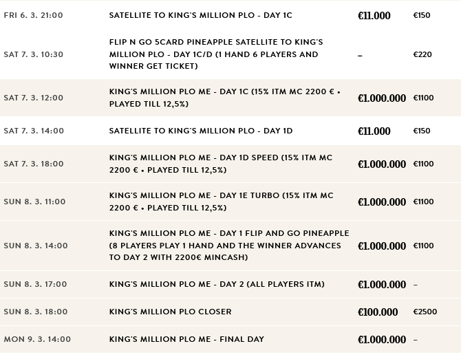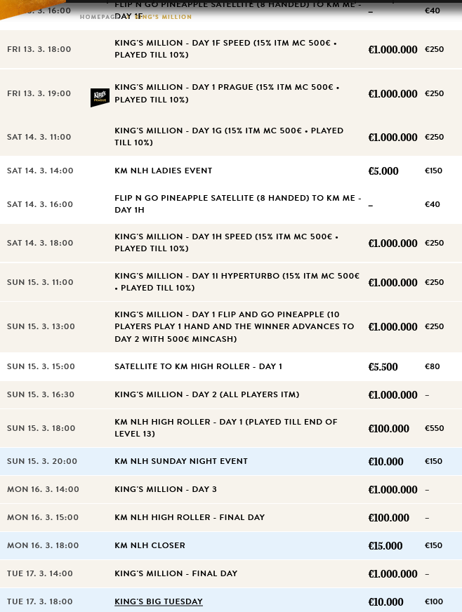 King’s: Der Schedule zum € 10.000.000 GTD King’s Million European Poker Championship Festival